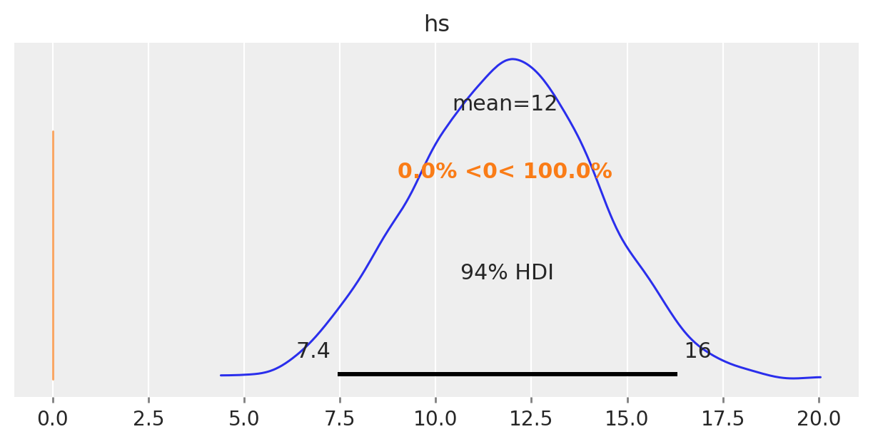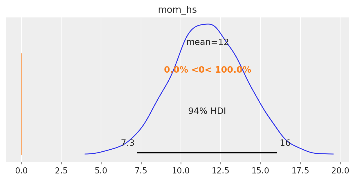 Il test bayesiano di ipotesi può essere svolto, per esempio, calcolando la probabilità che \(\beta_{mean\_diff} > 0\). Questa probabilità è 1, per cui concludiamo che la media del gruppo codificato con «mom_hs = 1» è maggiore della media del gruppo codificato con «mom_hs = 0».