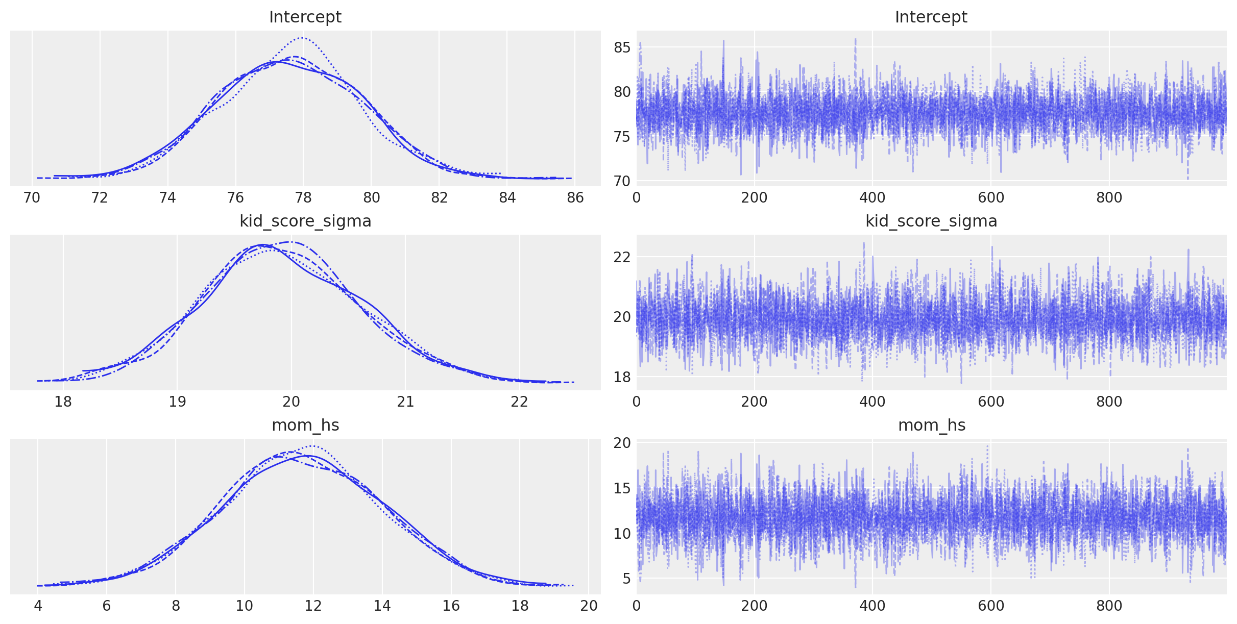 <xarray.Dataset> Size: 104kB Dimensions: (chain: 4, draw: 1000) Coordinates: * chain (chain) int64 32B 0 1 2 3 * draw (draw) int64 8kB 0 1 2 3 4 5 6 ... 994 995 996 997 998 999 Data variables: Intercept (chain, draw) float64 32kB 78.58 77.08 ... 79.21 76.52 kid_score_sigma (chain, draw) float64 32kB 21.18 19.7 20.55 ... 19.73 19.83 mom_hs (chain, draw) float64 32kB 11.91 11.08 ... 11.37 11.91 Attributes: created_at: 2024-06-16T07:47:48.798315+00:00 arviz_version: 0.18.0 modeling_interface: bambi modeling_interface_version: 0.13.0