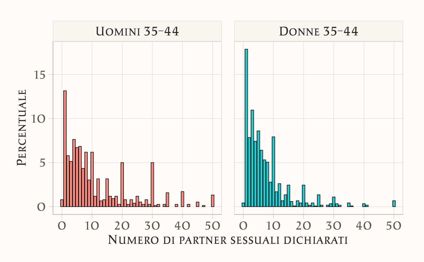 Questa differenza indica che le distribuzioni dei due gruppi condividono una base simile (molti individui con pochi partner) ma divergono nella coda superiore: negli uomini, pochi soggetti con valori estremi spingono la distribuzione verso destra, generando una maggiore asimmetria positiva.