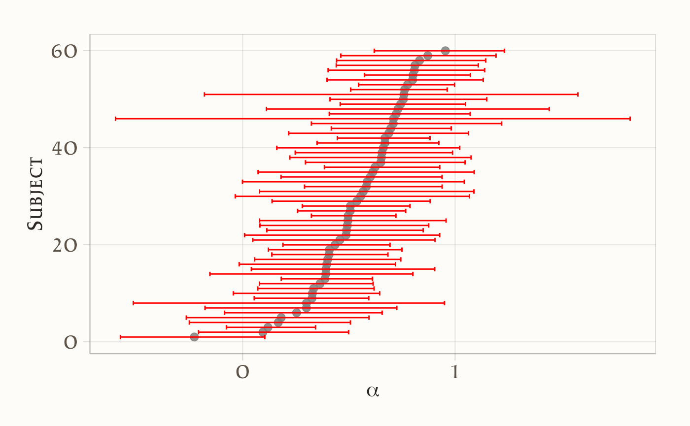 Person-level: stime soggetto-specifiche di \((\alpha_i, \beta_i)\) rivelano una marcata eterogeneità tra individui (diversa velocità di aggiornamento e diversa deriva). Il prezzo da pagare è l’assenza di condivisione dell’informazione: le stime restano fragili quando i dati per soggetto sono scarsi.
