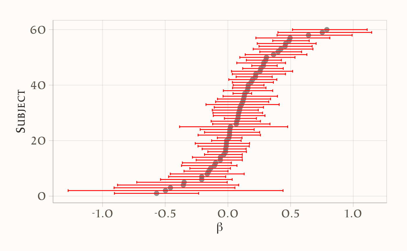 Il modello sample-level stima un unico insieme di parametri \((\alpha, \beta)\) per l’intero campione, ignorando le differenze individuali. Per cogliere questa eterogeneità, è possibile introdurre il modello a livello individuale (person-level), che stima parametri distinti \((\alpha_i, \beta_i)\) per ogni partecipante \(i\).
