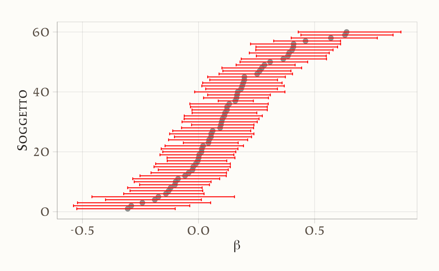 - Modello a livello individuale: stima di \(\alpha_i\) e \(\beta_i\) per ogni soggetto.