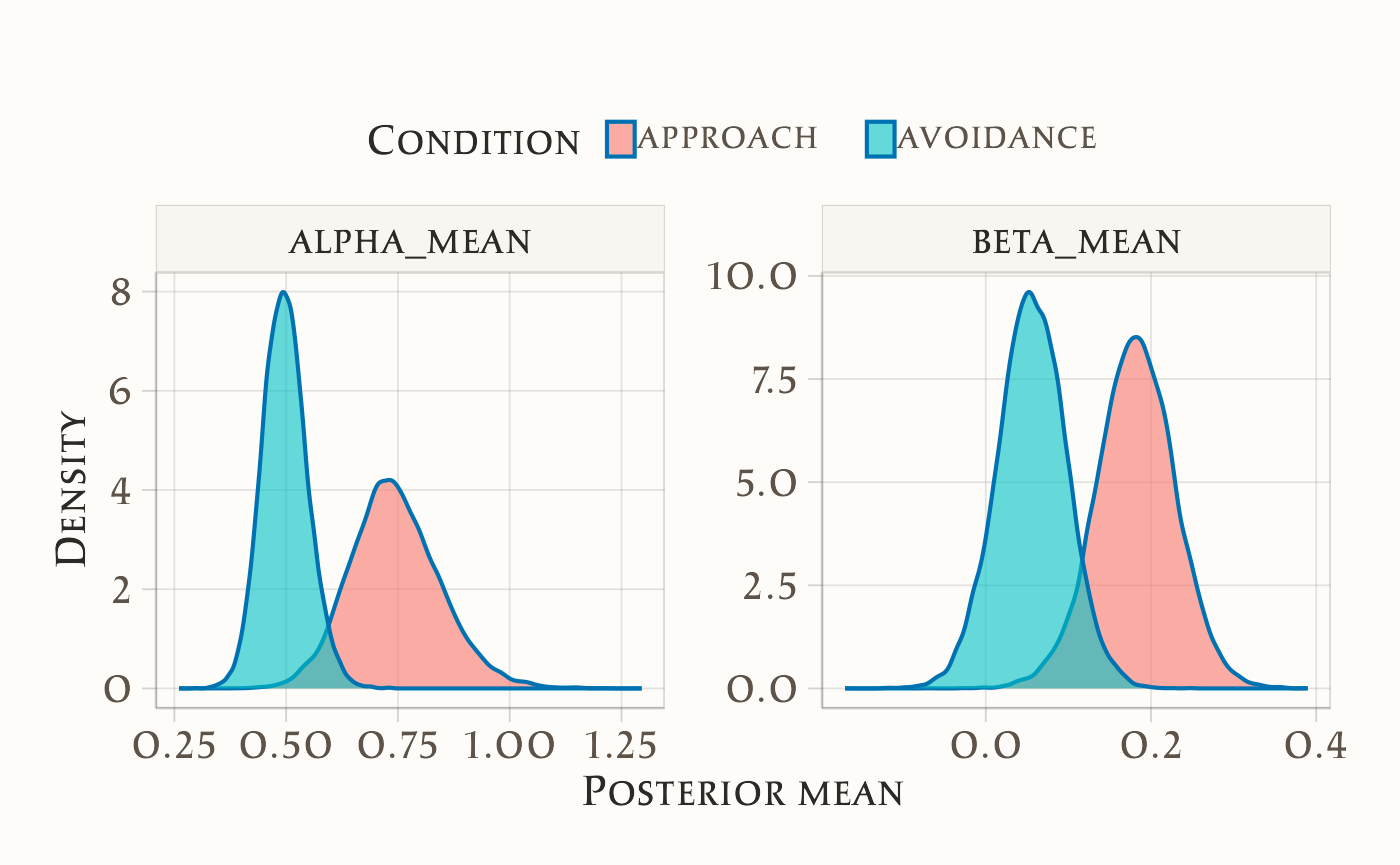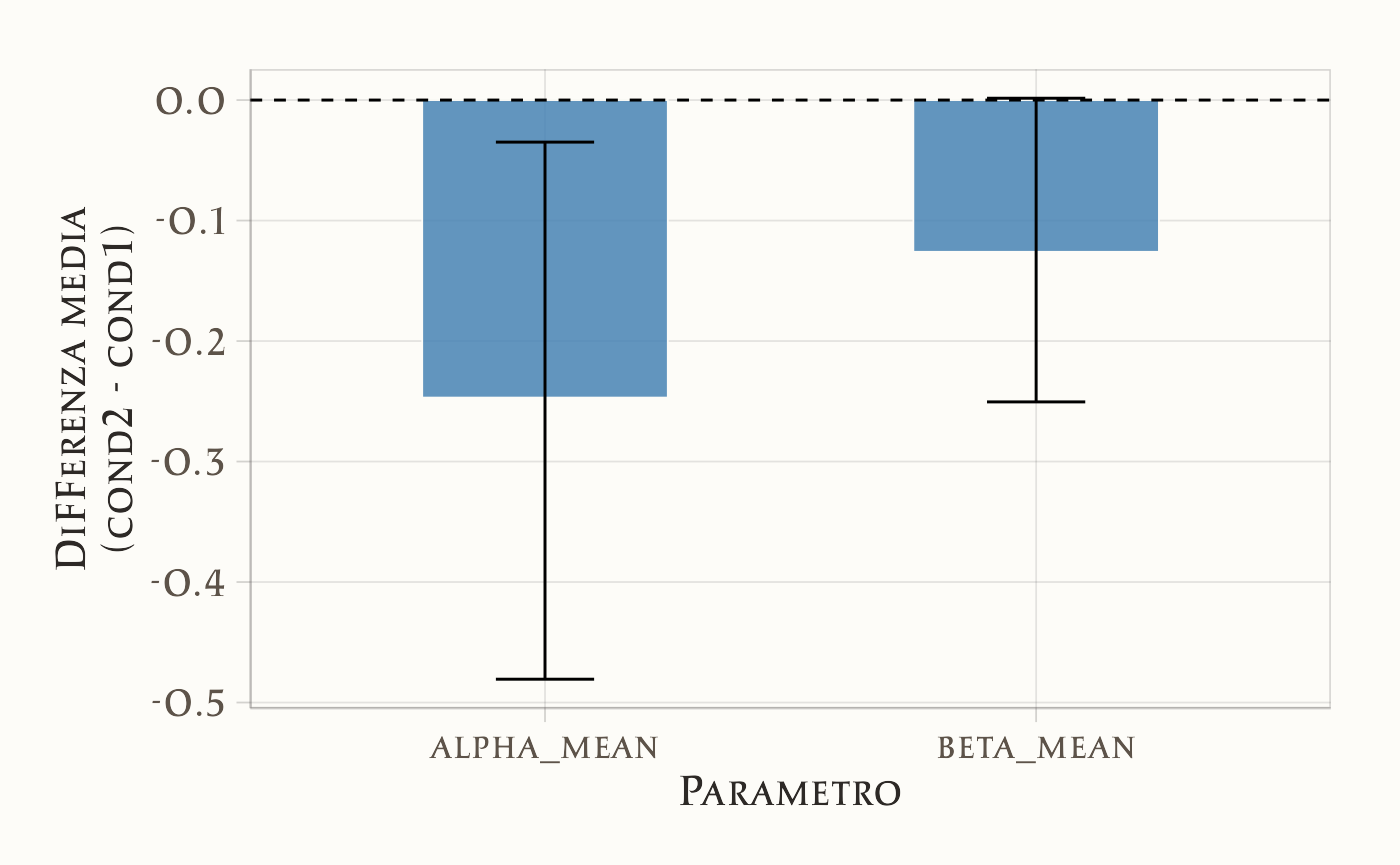\(\Delta_\beta\) (avoidance − approach) Media = −0.126; CrI 95% = [−0.251, 0.002]; \(P(\Delta<0) = 0.974\). → La probabilità che \(\beta\) sia più basso in avoidance è elevata, ma l’intervallo credibile include lo zero. Evidenza suggestiva ma non conclusiva.