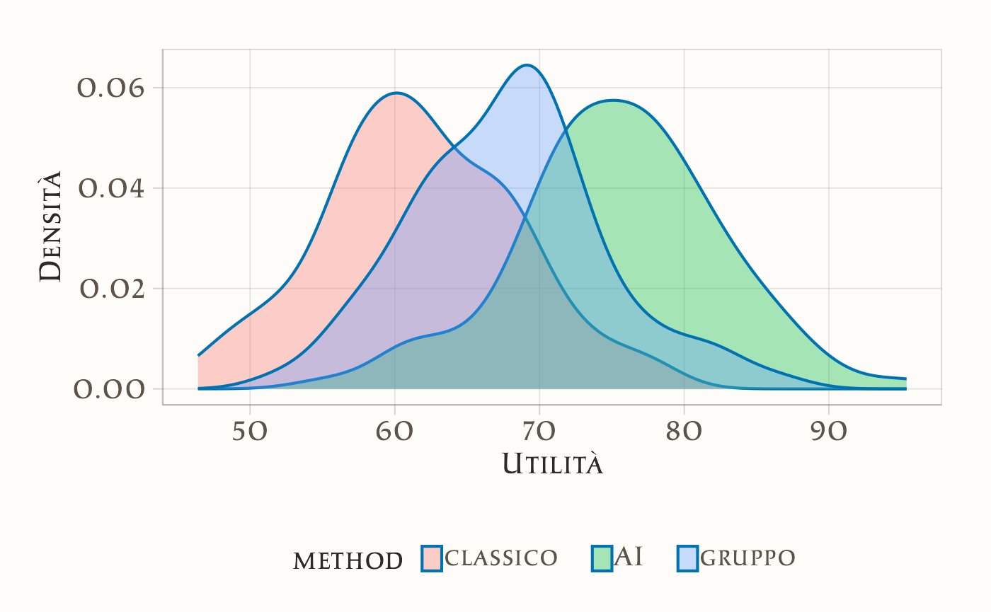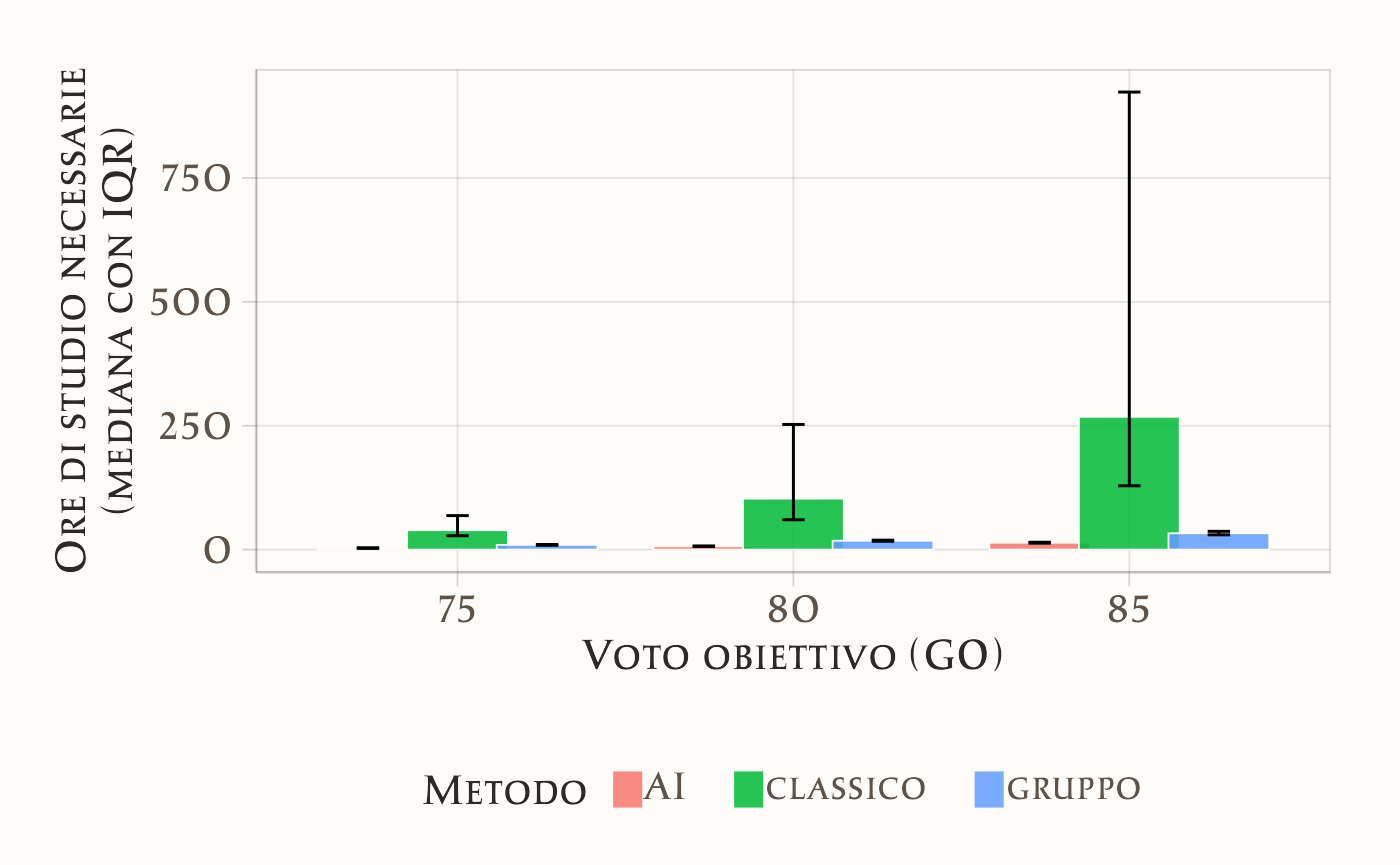 - Efficienza a parità di ore: il metodo AI tende a produrre voti più alti e quindi maggiore utilità, ma il vantaggio può ridursi se richiede più tempo.