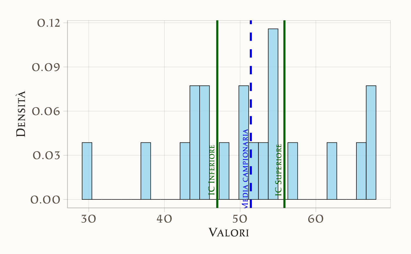 Creiamo un grafico per mostrare la distribuzione dei dati, la media campionaria e l’intervallo di confidenza: