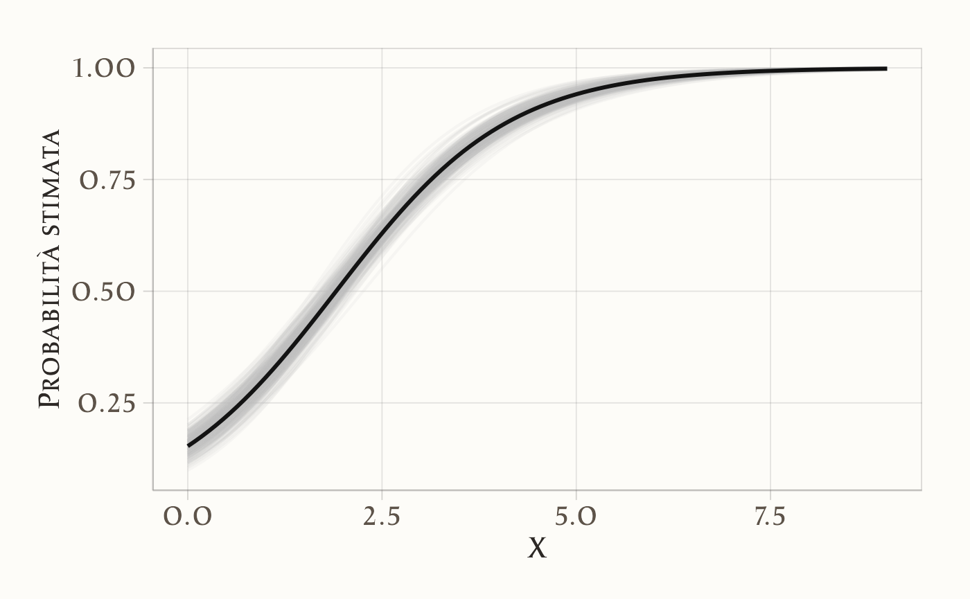 Il grafico mostra come i dati sostengano un’intera famiglia di curve logistiche compatibili: la linea nera è la media posteriore, mentre le linee grigie rendono visibile l’incertezza.