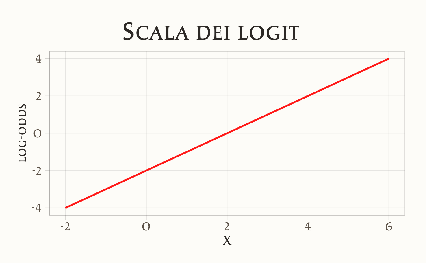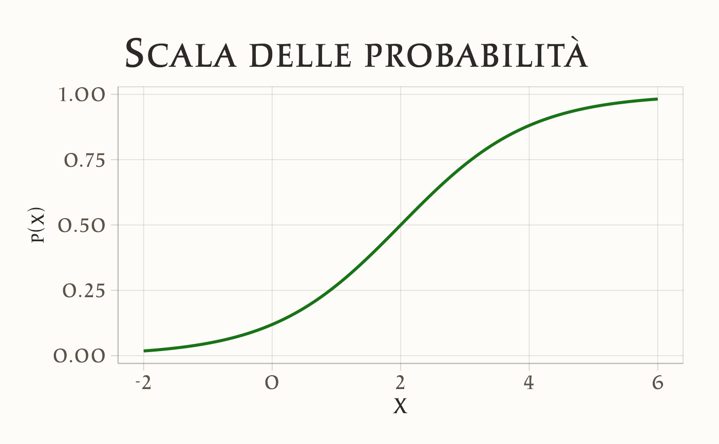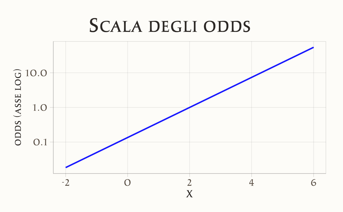 - Scala odds: la crescita è esponenziale. Qui \(\exp(\beta)\) indica di quanto si moltiplicano gli odds per ogni unità aggiuntiva di \(x\).