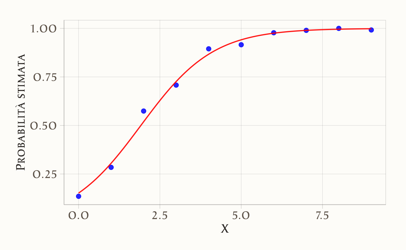 Simuliamo dati con un predittore discreto \(X\) e una variabile dicotomica \(Y\), in cui la probabilità di successo cresce con \(X\). Applichiamo quindi la regressione logistica e tracciamo la curva stimata, confrontandola con le proporzioni empiriche osservate.