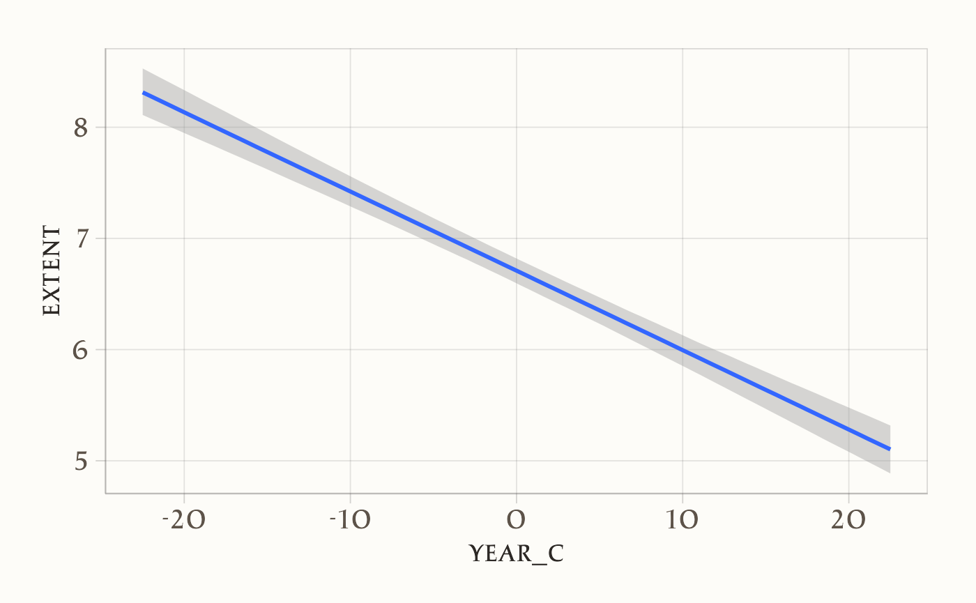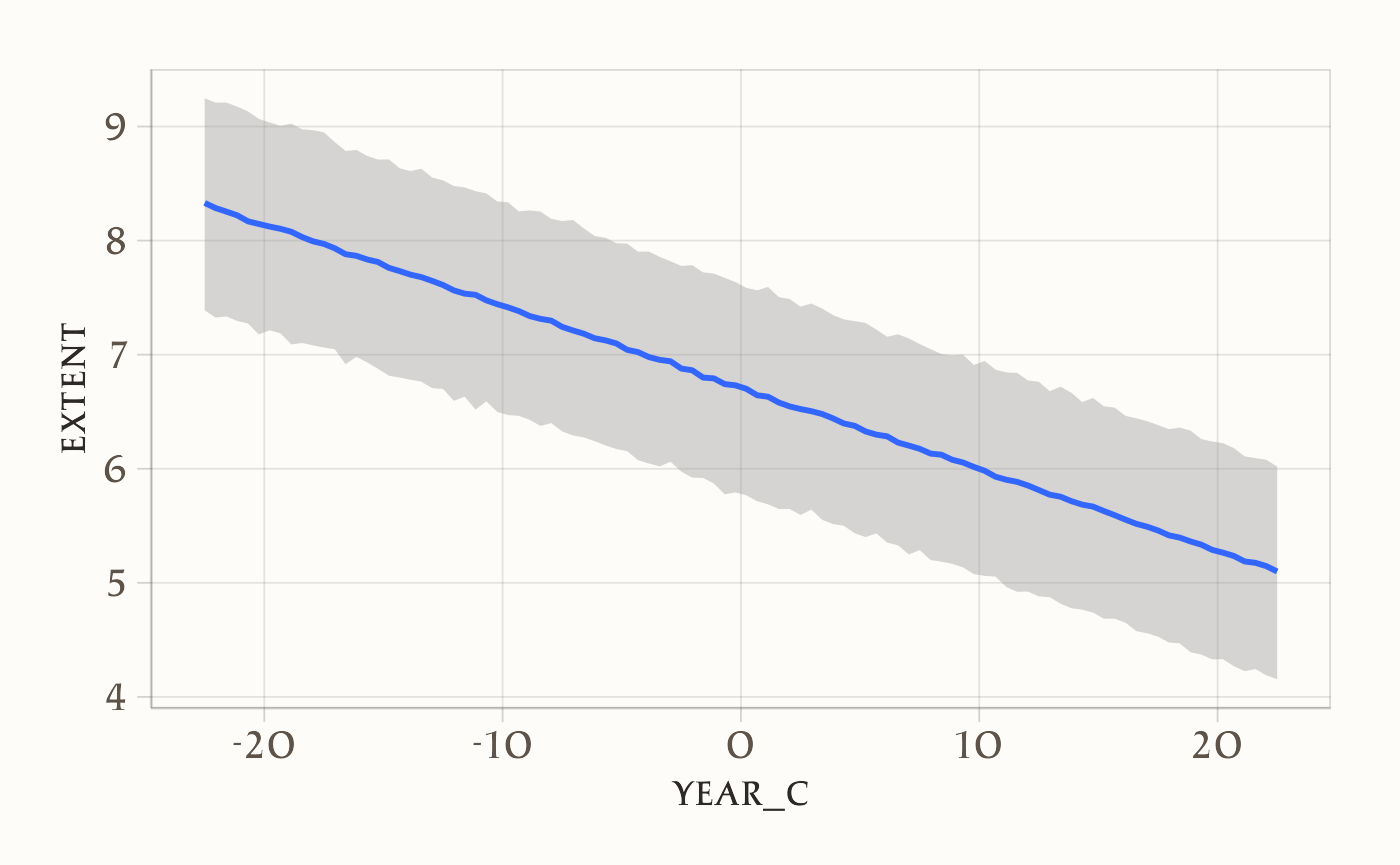 In questo modo, l’intercetta (\(\alpha\)) del modello rappresenterà l’estensione media prevista (extent, in milioni di km²) nell’anno medio del campione (cioè l’anno medio tra 1979 e 2024).