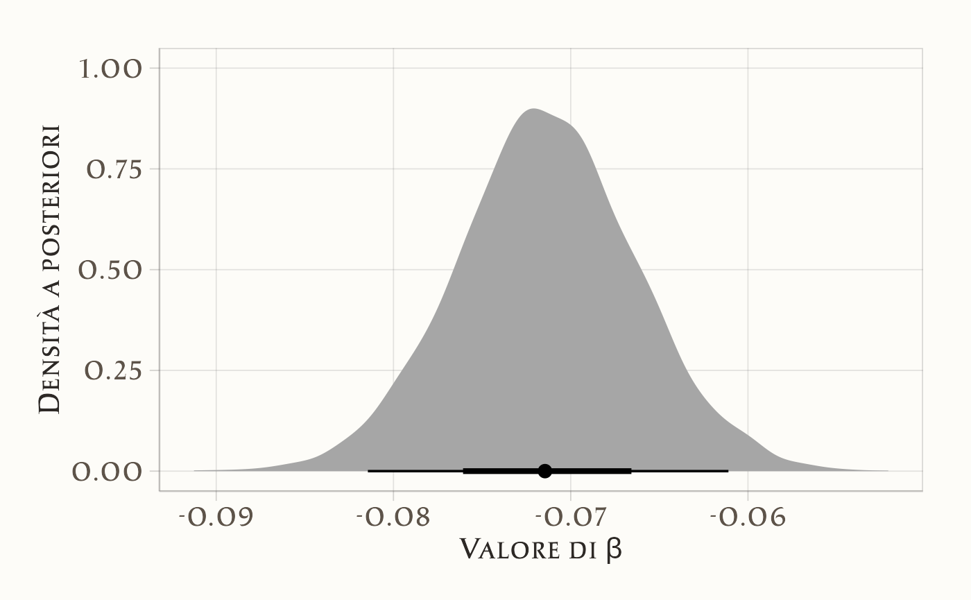 Per capire meglio la forma della distribuzione a posteriori, possiamo tracciarne la densità. Con tidyverse e tidybayes bastano poche righe: