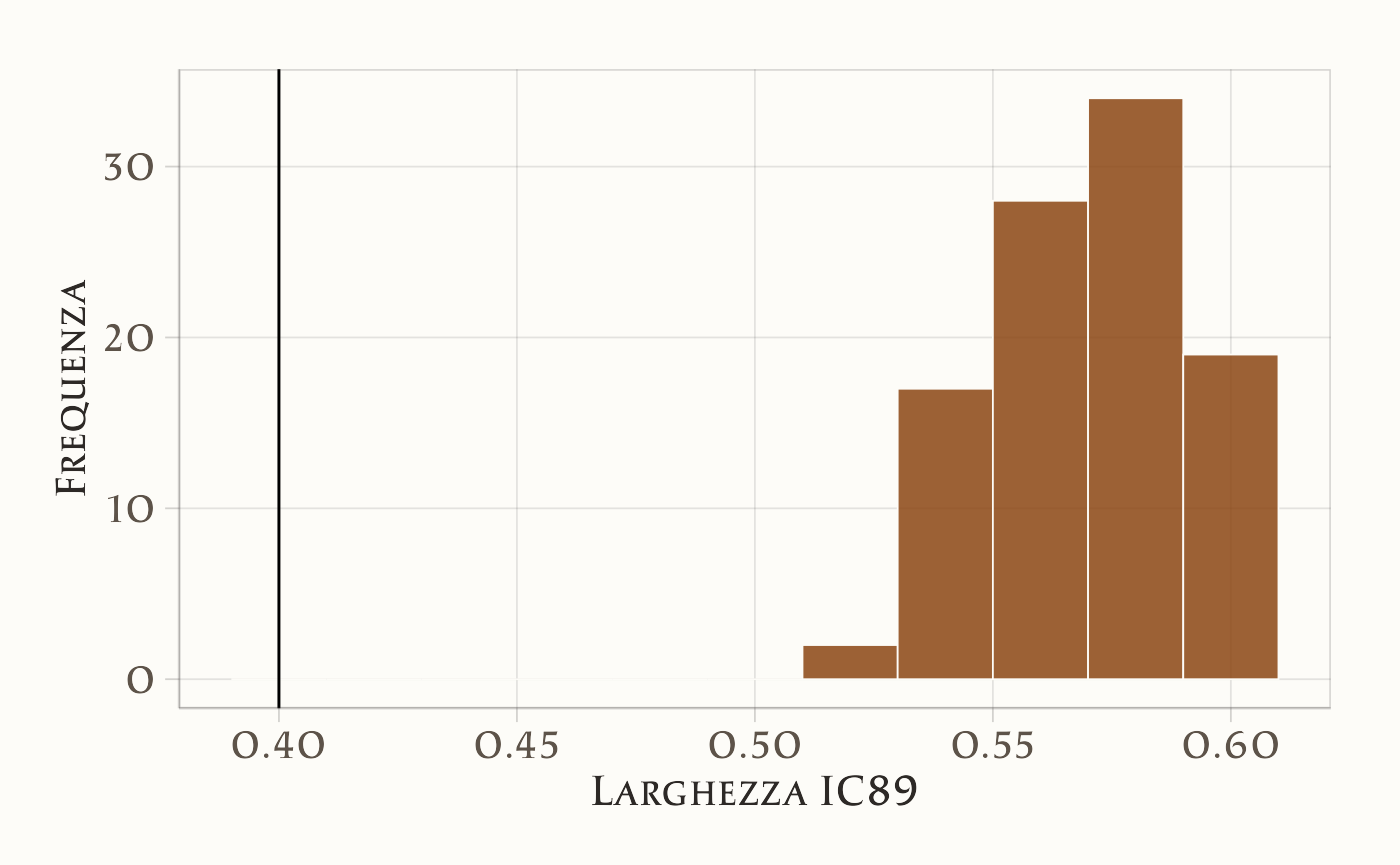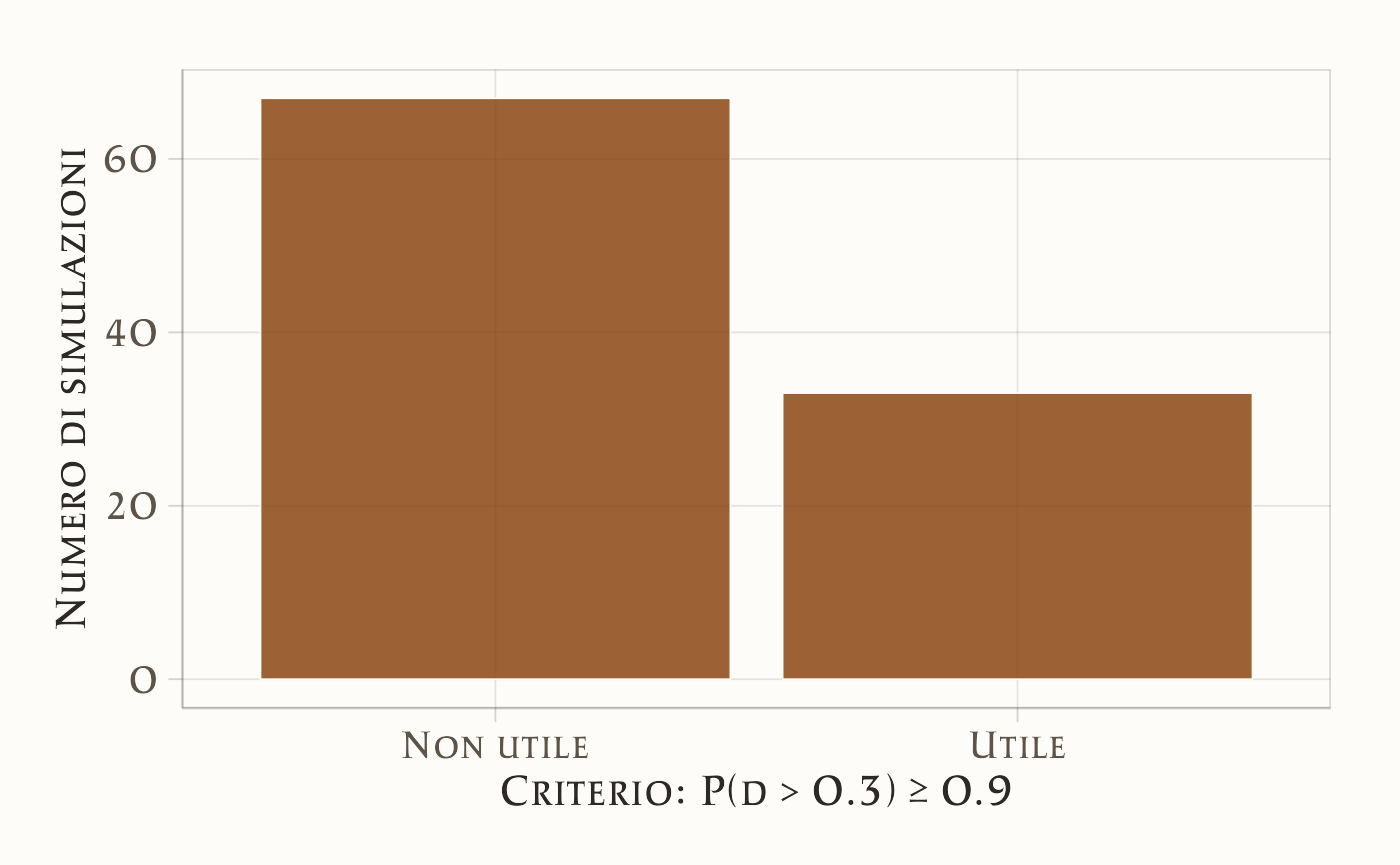 Il primo grafico mostra la distribuzione delle larghezze degli intervalli di credibilità all’89%, evidenziando quante simulazioni superano la soglia di 0.4. Il secondo mostra quante simulazioni soddisfano il criterio di utilità.