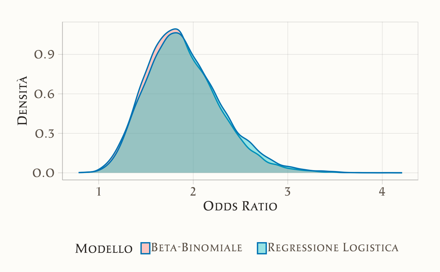 I grafici mostrano chiaramente che la distribuzione dell’odds ratio è concentrata su valori superiori a 1, con alta probabilità.