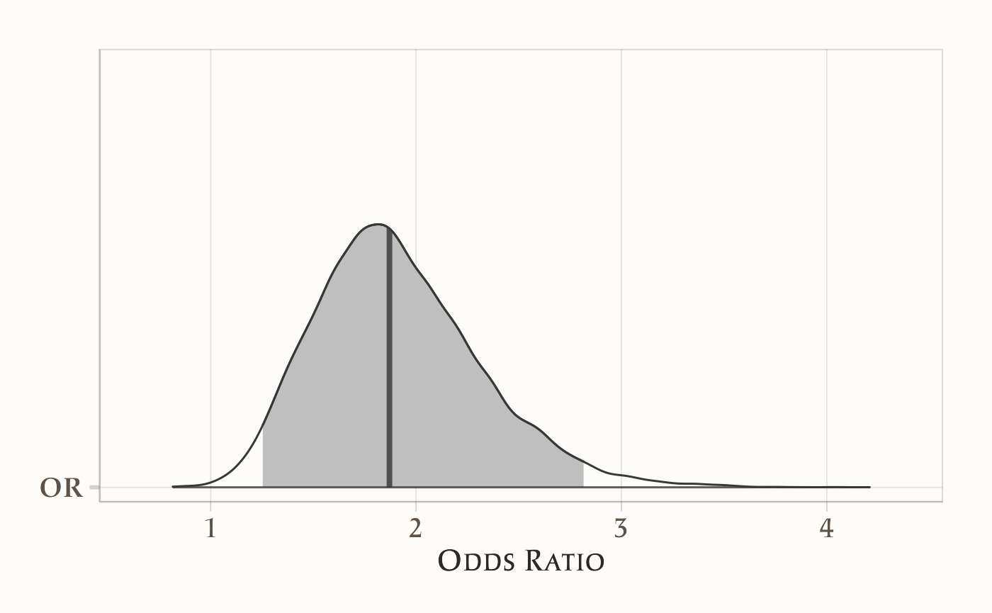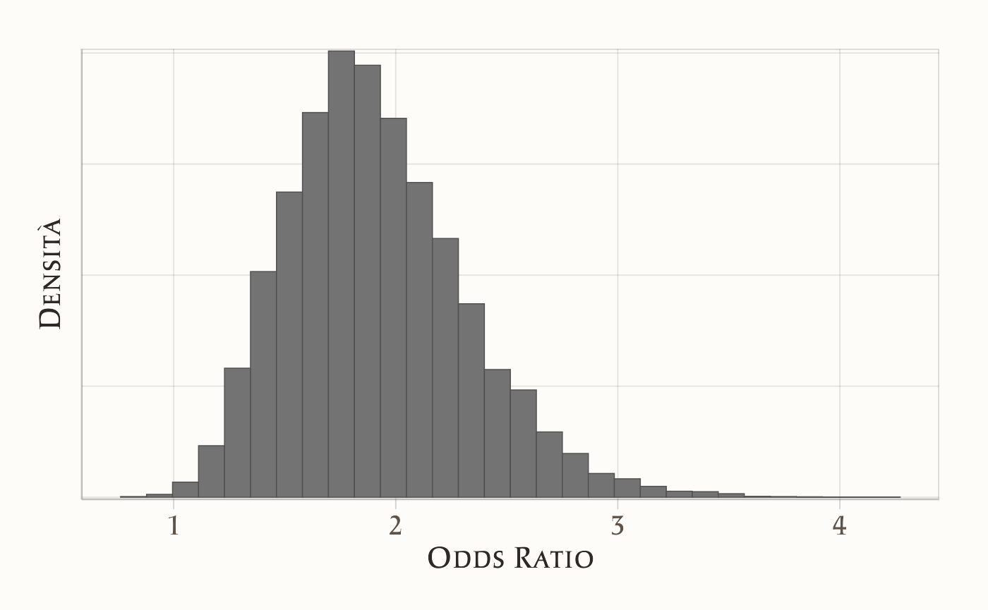 Quanto è affidabile questa stima? È a questo punto che l’approccio bayesiano mostra il suo valore: anziché limitarci a una stima puntuale, possiamo ottenere un’intera distribuzione a posteriori per l’OR, che esprime la nostra incertezza dopo aver osservato i dati.