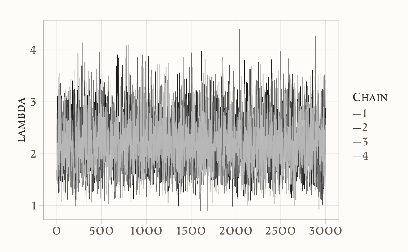Il modello di Poisson rappresenta quindi un banco di prova ideale per consolidare due aspetti fondamentali: da un lato, la generalità dell’inferenza bayesiana – la logica rimane la stessa, cambiano solo la forma della verosimiglianza e i parametri da stimare –; dall’altro, la potenza di Stan come strumento pratico per affrontare modelli che, pur essendo concettualmente semplici, diventano rapidamente complicati se implementati a mano.