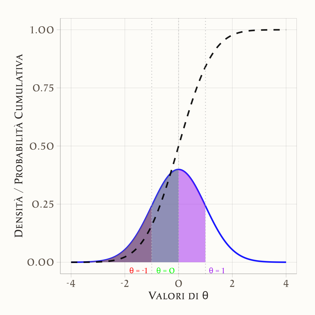 La funzione di ripartizione è strettamente legata alla funzione di densità di probabilità (PDF), \(f(\theta)\). Mentre la PDF descrive la densità di probabilità in ogni punto, la funzione di ripartizione rappresenta l’area sotto la curva della PDF fino a un certo valore \(\theta\). Formalmente, la funzione di ripartizione si ottiene integrando la PDF: