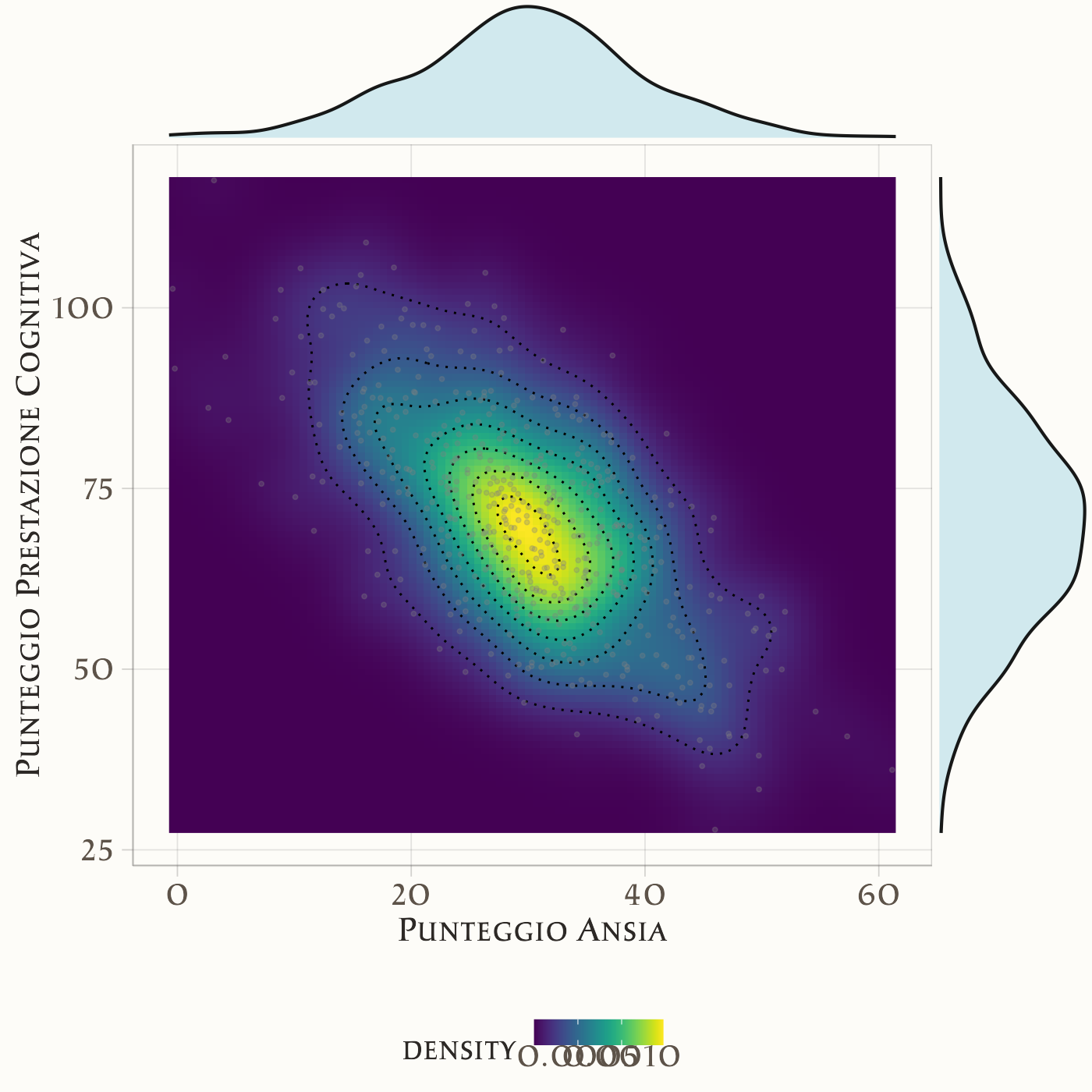 Se invece misuriamo ansia e prestazione come variabili continue (es. punteggi su scale numeriche), la distribuzione congiunta è una densità. Possiamo rappresentarla come una mappa termica: