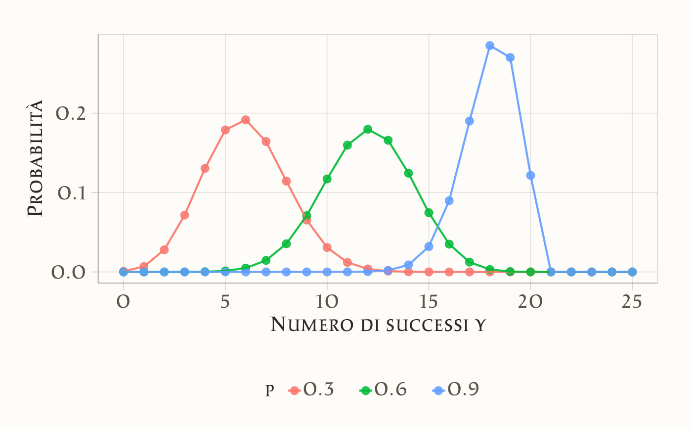 - Descrizione: La distribuzione binomiale descrive il numero totale di successi in un numero fisso \(n\) di prove indipendenti, ciascuna governata da una distribuzione di Bernoulli con probabilità di successo \(p\).