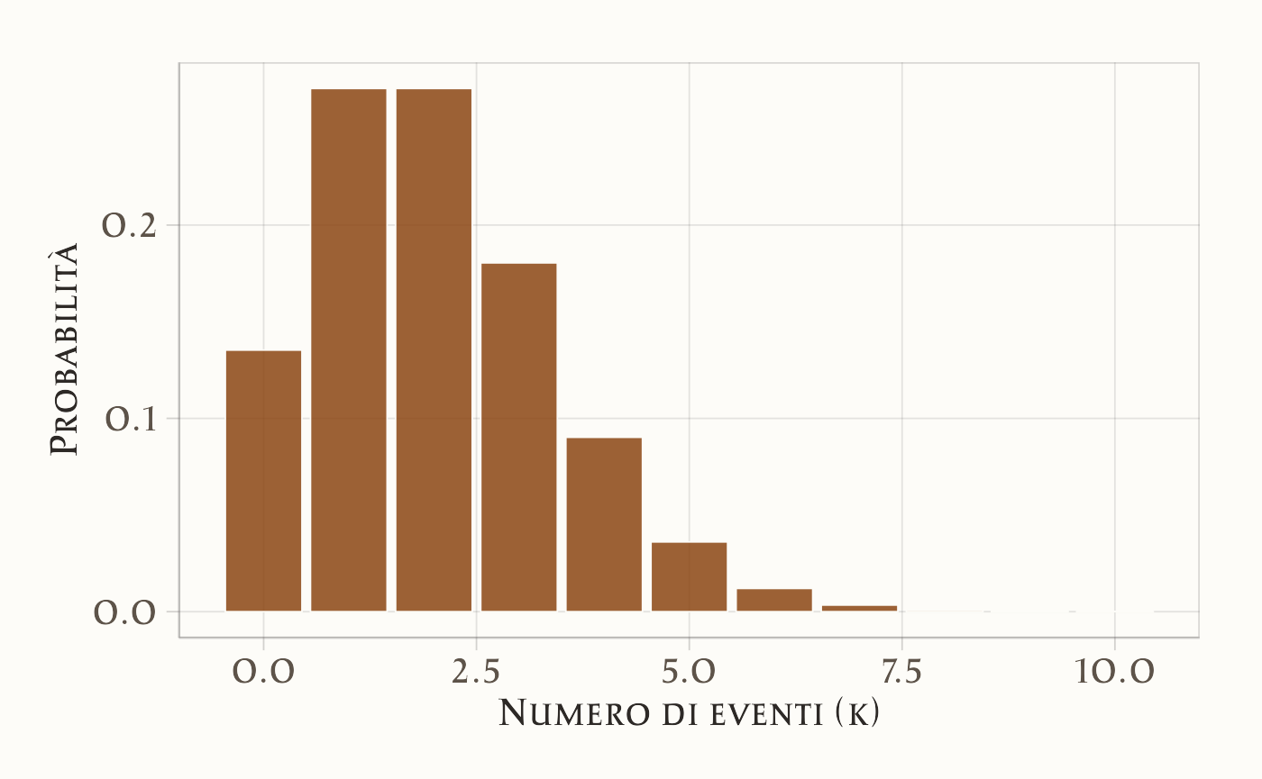 - Descrizione: La distribuzione di Poisson modella il numero di eventi che si verificano in un intervallo fissato di tempo o spazio, quando tali eventi sono rari, indipendenti e accadono a un tasso medio costante \(\lambda\).