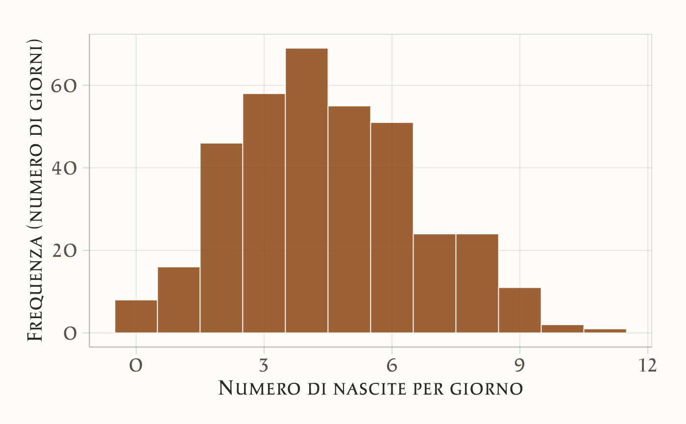 - Le barre rosse indicano le frequenze attese se il numero di decessi segue una distribuzione di Poisson con media \(\lambda = 0.61\).