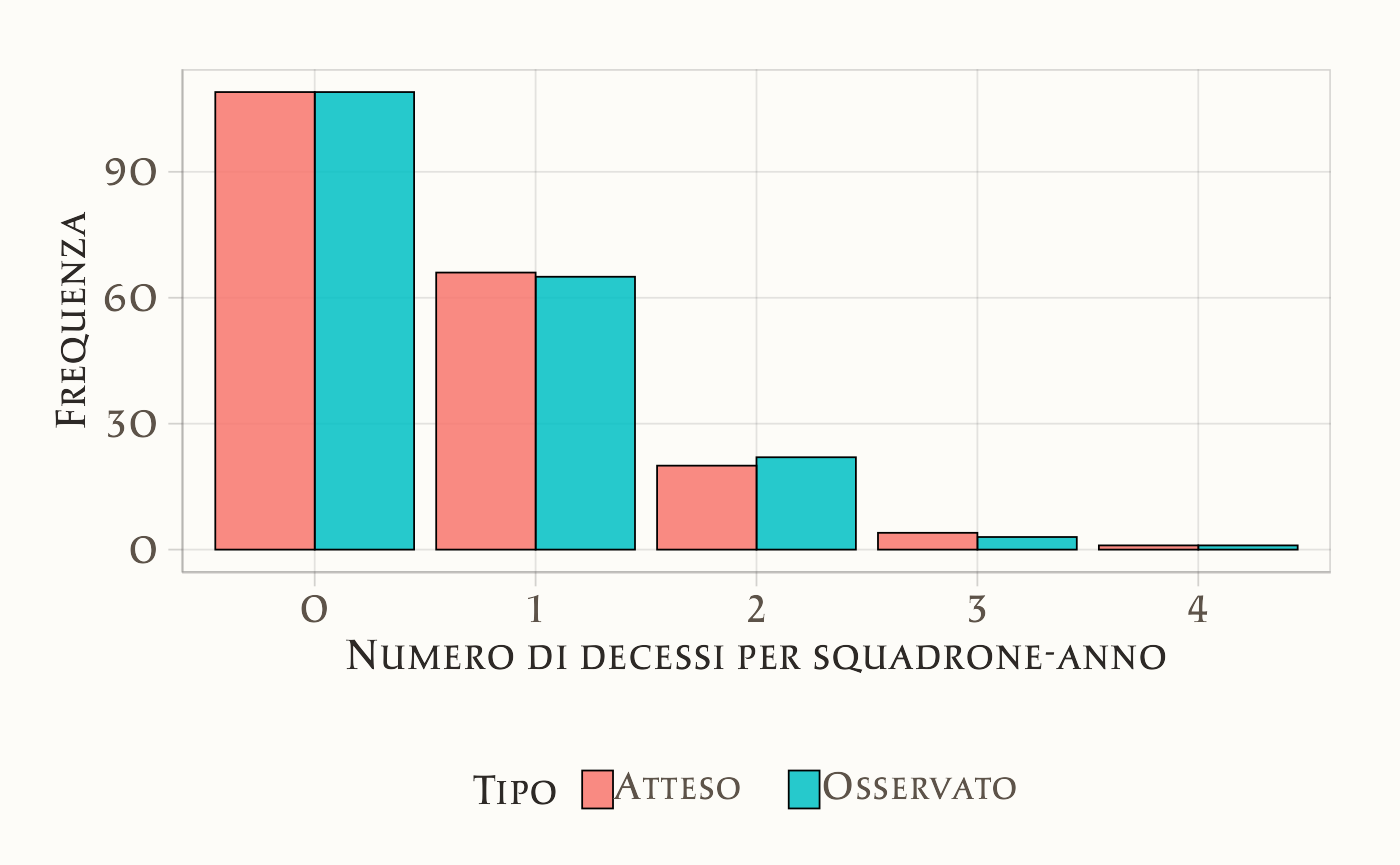 - Le barre blu mostrano i dati osservati da von Bortkiewicz.