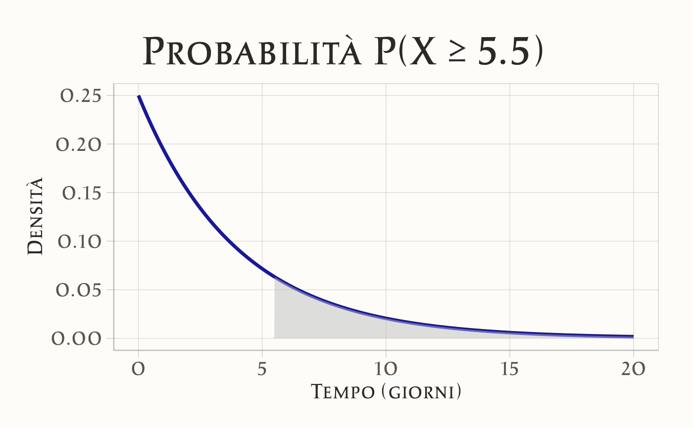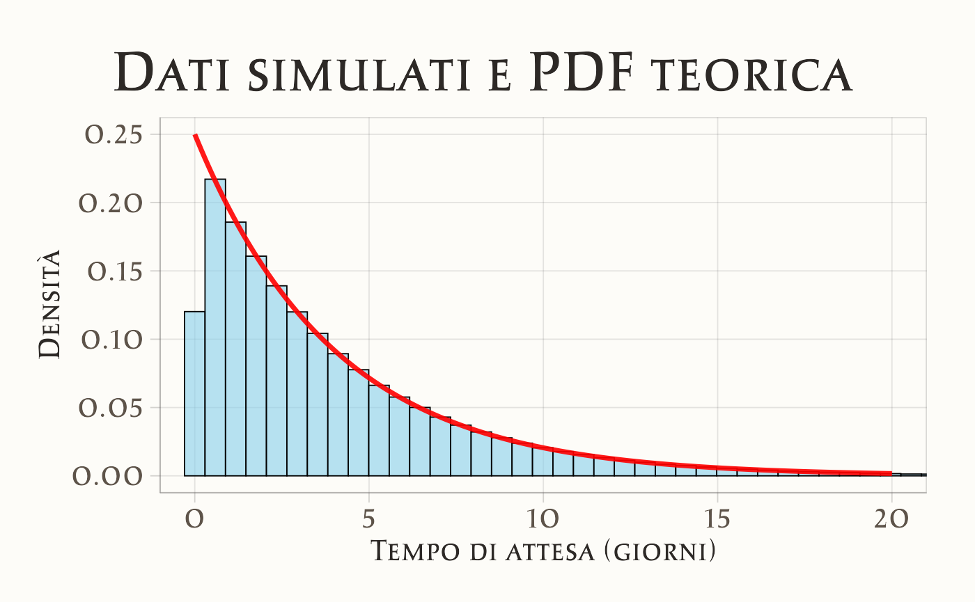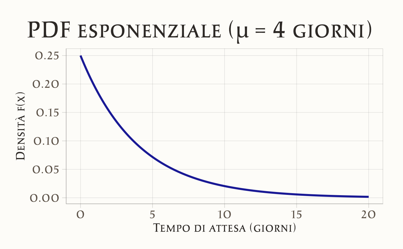 La distribuzione Gamma è ideale per modellare tempi di attesa, ad esempio, il tempo necessario affinché si verifichino \(n\) eventi in un processo di Poisson.-