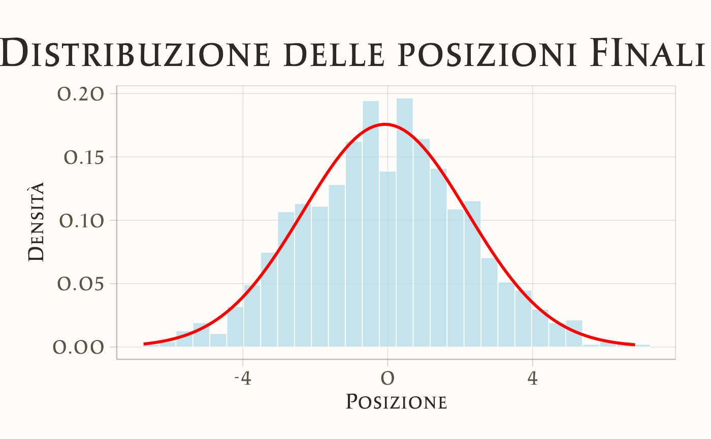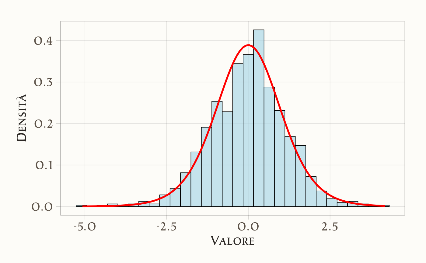 L’istogramma ora rivela un profilo piatto e regolare, in accordo con la forma teorica della distribuzione. Questo risultato dimostra empiricamente la Legge dei Grandi Numeri, dove all’aumentare delle osservazioni la distribuzione empirica converge a quella teorica.