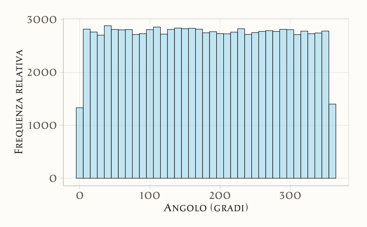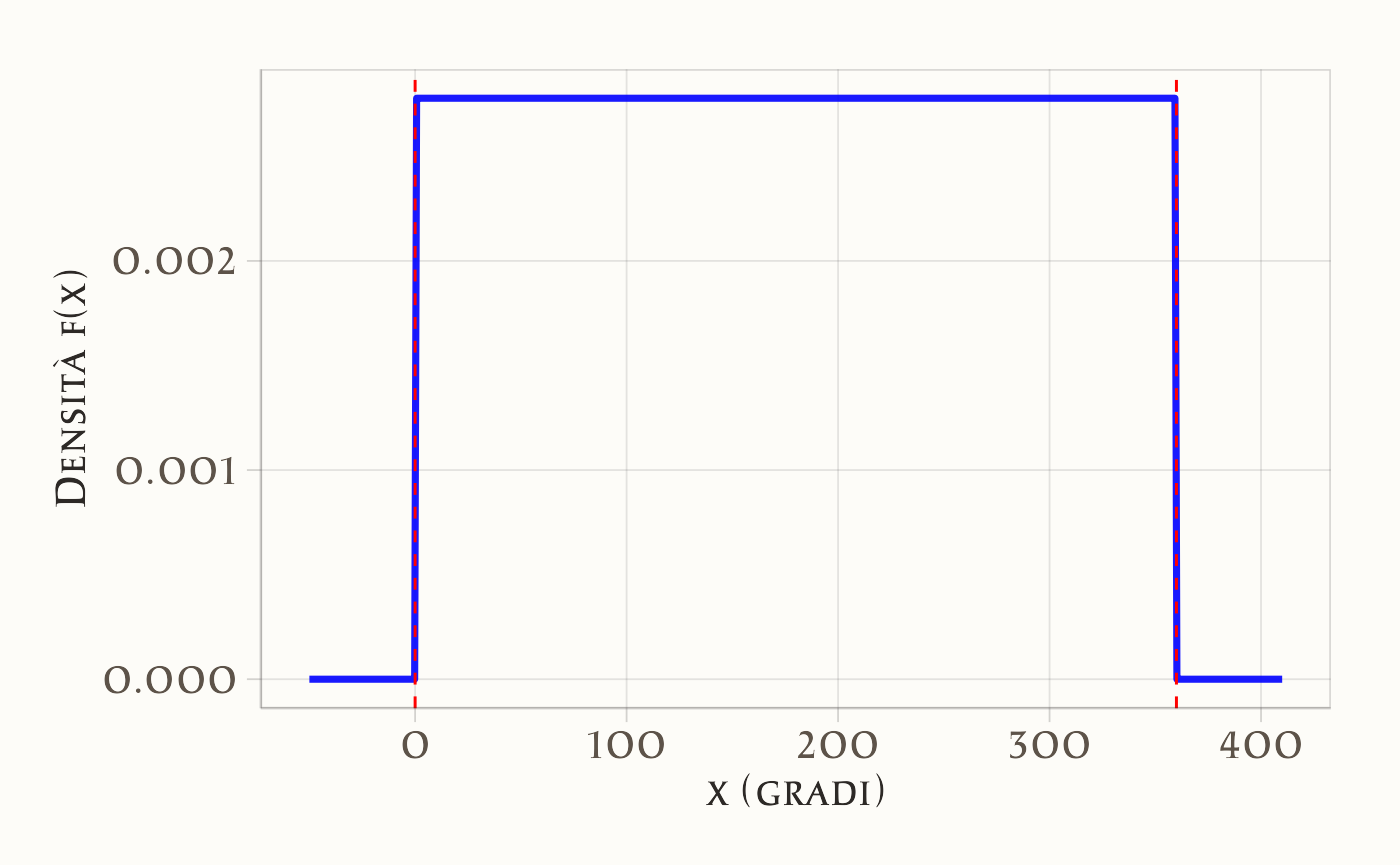 Il grafico evidenzia la densità costante nell’intervallo \([0, 360]\) e l’assenza di probabilità al di fuori di esso.