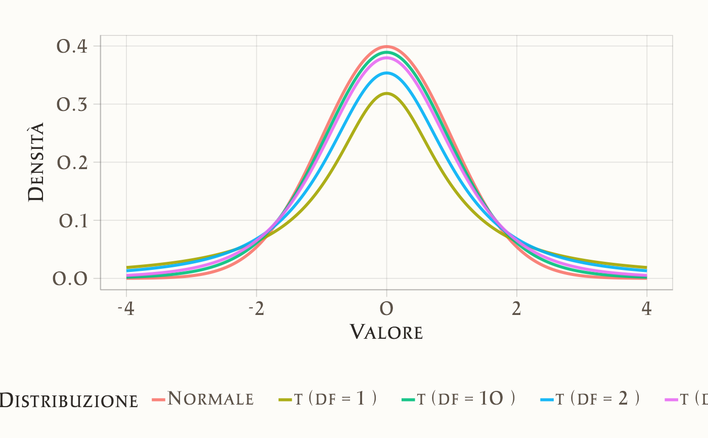 Le distribuzioni, come la \(t\) di Student, sono fondamentali per il confronto tra campioni, mentre la Normale è indispensabile per modellare fenomeni che seguono la legge del limite centrale.Generazione e Simulazione di Dati: