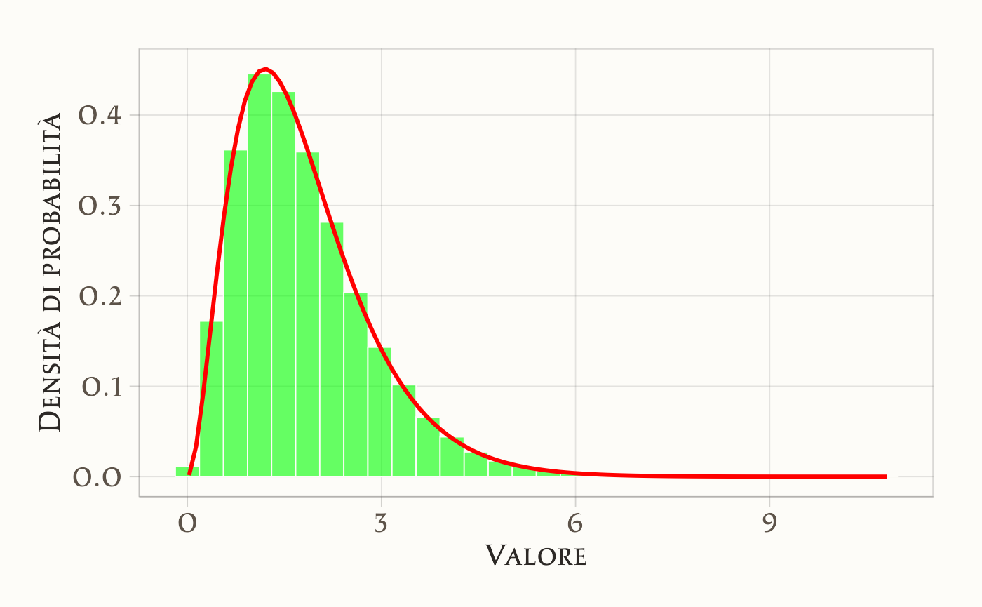 # Generazione di dati set.seed(123) data <- rgamma(100000, shape = alpha, rate = beta) # Data frame per ggplot df <- data.frame(values = data) # Plot ggplot(df, aes(x = values)) + geom_histogram(aes(y = ..density..), bins = 30, fill = "green", alpha = 0.6) + stat_function(fun = function(x) dgamma(x, shape = alpha, rate = beta), color = "red", size = 1) + labs( x = "Valore", y = "Densità di probabilità" )