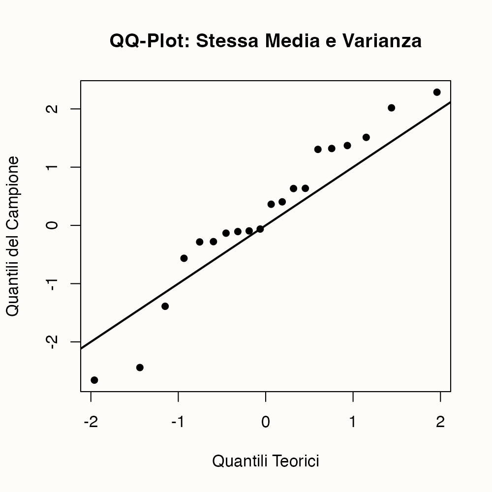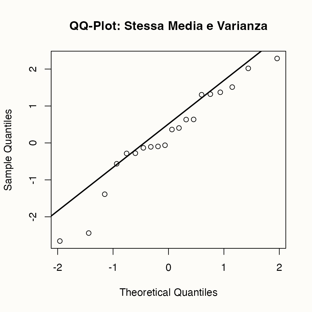 main = "QQ-Plot: Stessa Media e Varianza", pch = 16)