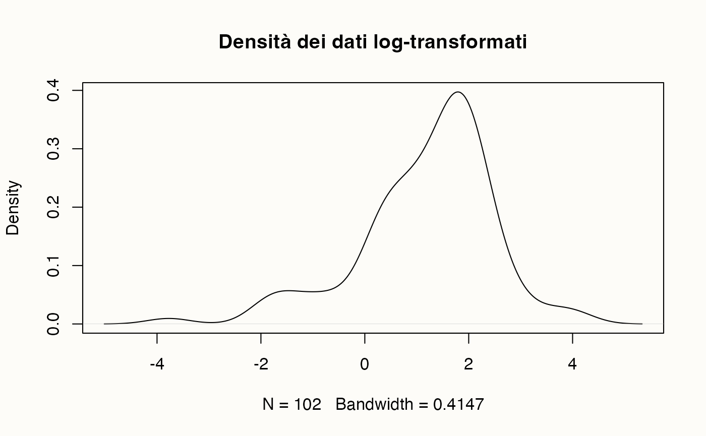 plot(density(dati_log), main = "Densità dei dati log-transformati")
