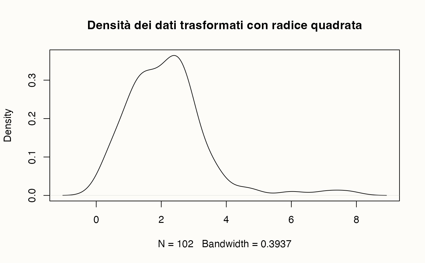 plot(density(dati_sqrt), main = "Densità dei dati trasformati con radice quadrata")