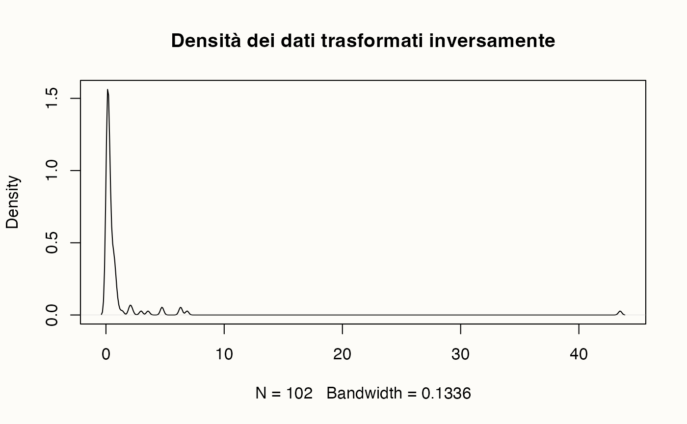L’istogramma mostra la distribuzione empirica dei dati, mentre la curva rossa rappresenta la densità normale con la stessa media e deviazione standard. Nel nostro caso, è evidente una discrepanza tra la distribuzione empirica e la densità normale, indicando che l’assunzione di normalità non è appropriata.