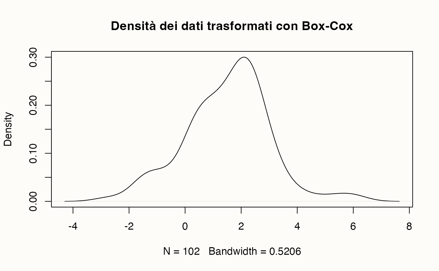 La trasformazione Box-Cox è una tecnica parametrica che generalizza le precedenti. Utilizza il massimo della verosimiglianza per determinare la trasformazione ottimale per normalizzare i dati. La funzione di trasformazione dipende da un parametro \(\lambda\):
