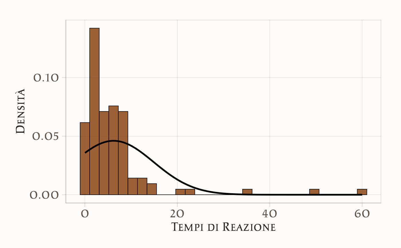 Per illustrare il concetto, utilizziamo un set di dati simulati che hanno proprietà simili a quelle dei tempi di reazione. Creeremo un istogramma e vi sovrapporremo la curva di densità normale calcolata in base ai dati.