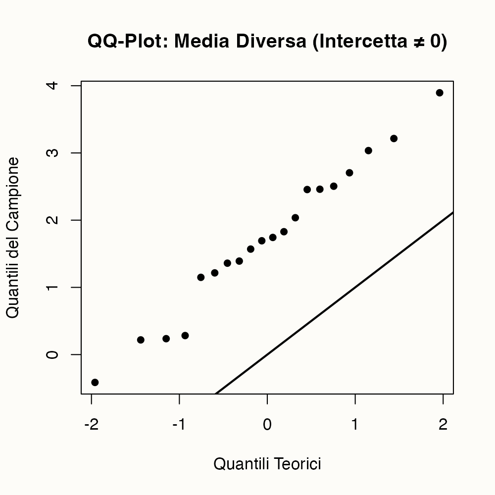 - Intercetta diversa da 0: indica che la media del campione differisce dalla media della distribuzione teorica.
