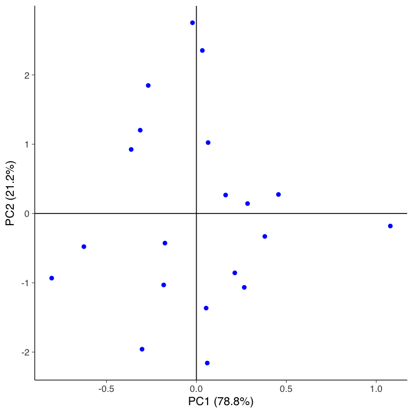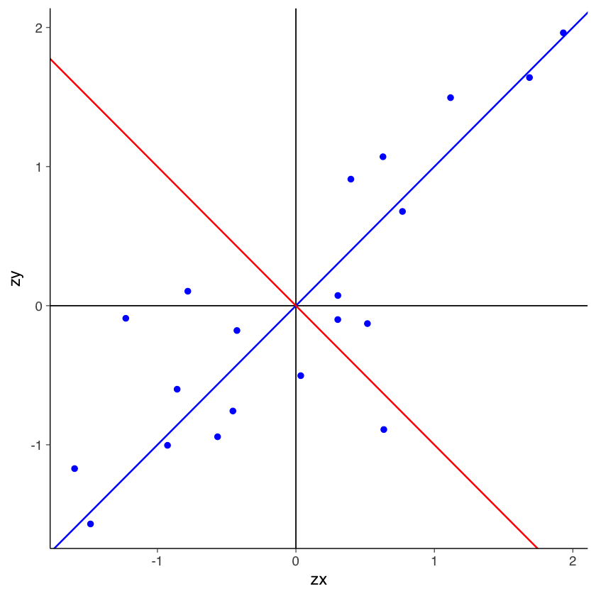 Inizio standardizzando i dati, in modo che il centro del sistema di assi coordinati corrisponda con la media delle due variabili.