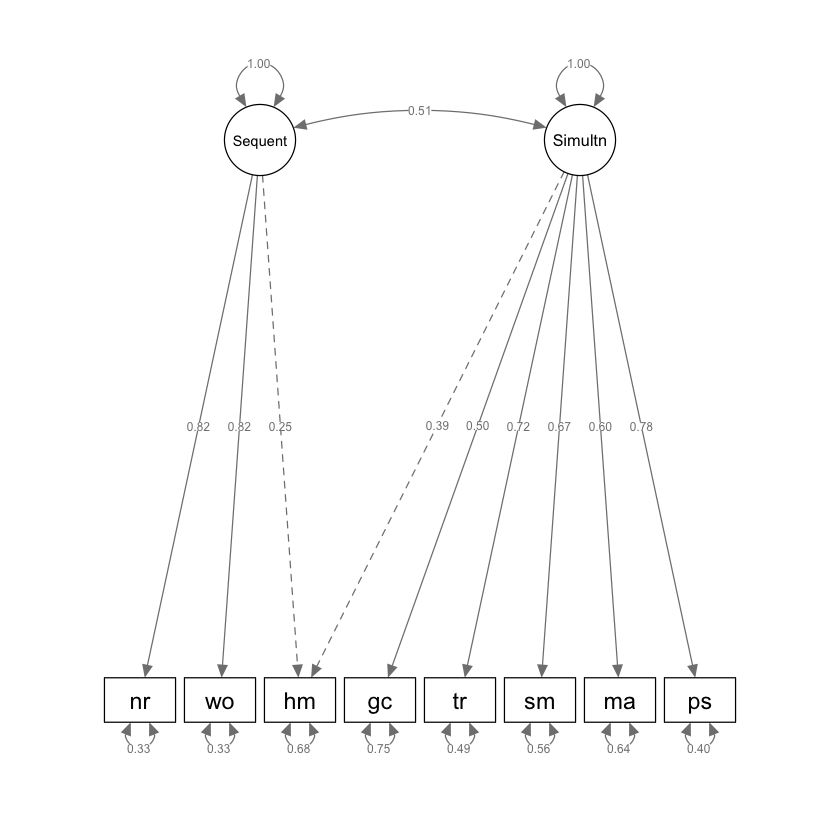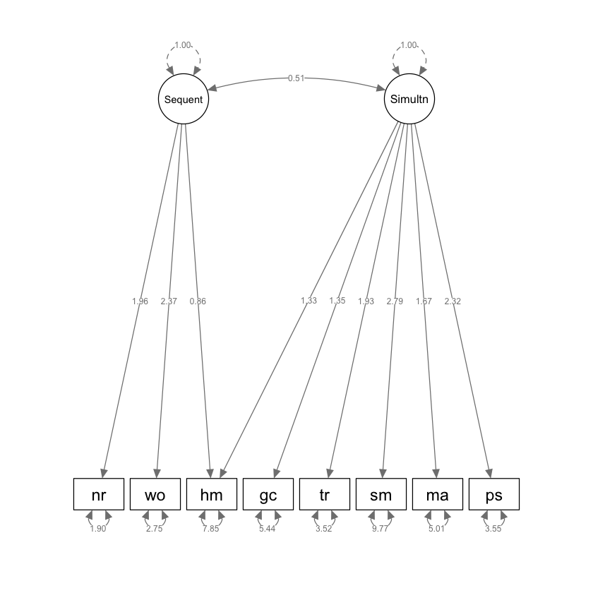 Nell’ambito di un modello a due fattori, i risultati ottenuti dall’esempio in esame evidenziano alcune criticità in relazione al criterio più stringente: il modello non riesce a spiegare una variazione significativa (R^2 > 0.50) per quattro dei otto indicatori, ossia la metà di essi. Tuttavia, se consideriamo l’AVE, i risultati migliorano leggermente per il fattore sequenziale, che spiega in media circa il 52% della varianza dei suoi tre indicatori (AVE = 0.517).