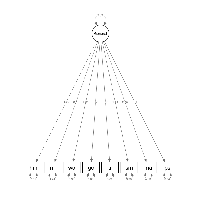 Idealmente, per sostenere l’ipotesi di validità convergente, un fattore dovrebbe spiegare almeno il 50% della varianza in ciascuno dei suoi indicatori continui, come sostengono Bagozzi e Yi (2012). Ciò implica che, per essere considerato adeguatamente rappresentativo del costrutto che intende misurare, tutti gli indicatori di un fattore dovrebbero mostrare che la maggior parte della loro varianza è spiegata dal fattore stesso. Un modo meno rigoroso ma ancora informativo per valutare la validità convergente è attraverso l’uso della Varianza Media Estratta (AVE), calcolata come la media dei quadrati dei carichi fattoriali standardizzati di tutti gli indicatori associati a un particolare fattore. Un valore AVE superiore a 0.50 indica che, in media, il fattore spiega più della metà della varianza degli indicatori rispetto alla varianza residua attribuibile agli errori di misurazione, come indicato da Hair et al. (2022).