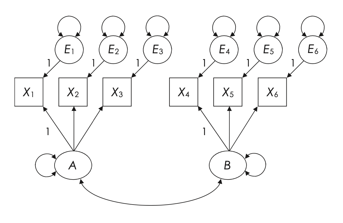 Un esempio di modello CFA di base con due fattori e sei indicatori viene presentato di seguito, dove tutti i carichi incrociati sono fissati a zero, Fig. 38.1. Per esempio, il fattore B non ha un effetto causale diretto sull’indicatore X1, il quale è misurato da un altro fattore (A). Tuttavia, ciò non significa che X1 e il fattore B siano completamente scorrelati. La struttura del modello permette a X1 di covariare con B poiché B è correlato con A, che è una causa di X1 (l’altra causa è E1, il termine di errore di X1). In modo simile, si prevede che gli indicatori X1 e X4 covarino poiché sono influenzati dai fattori A e B, rispettivamente, i quali sono correlati.