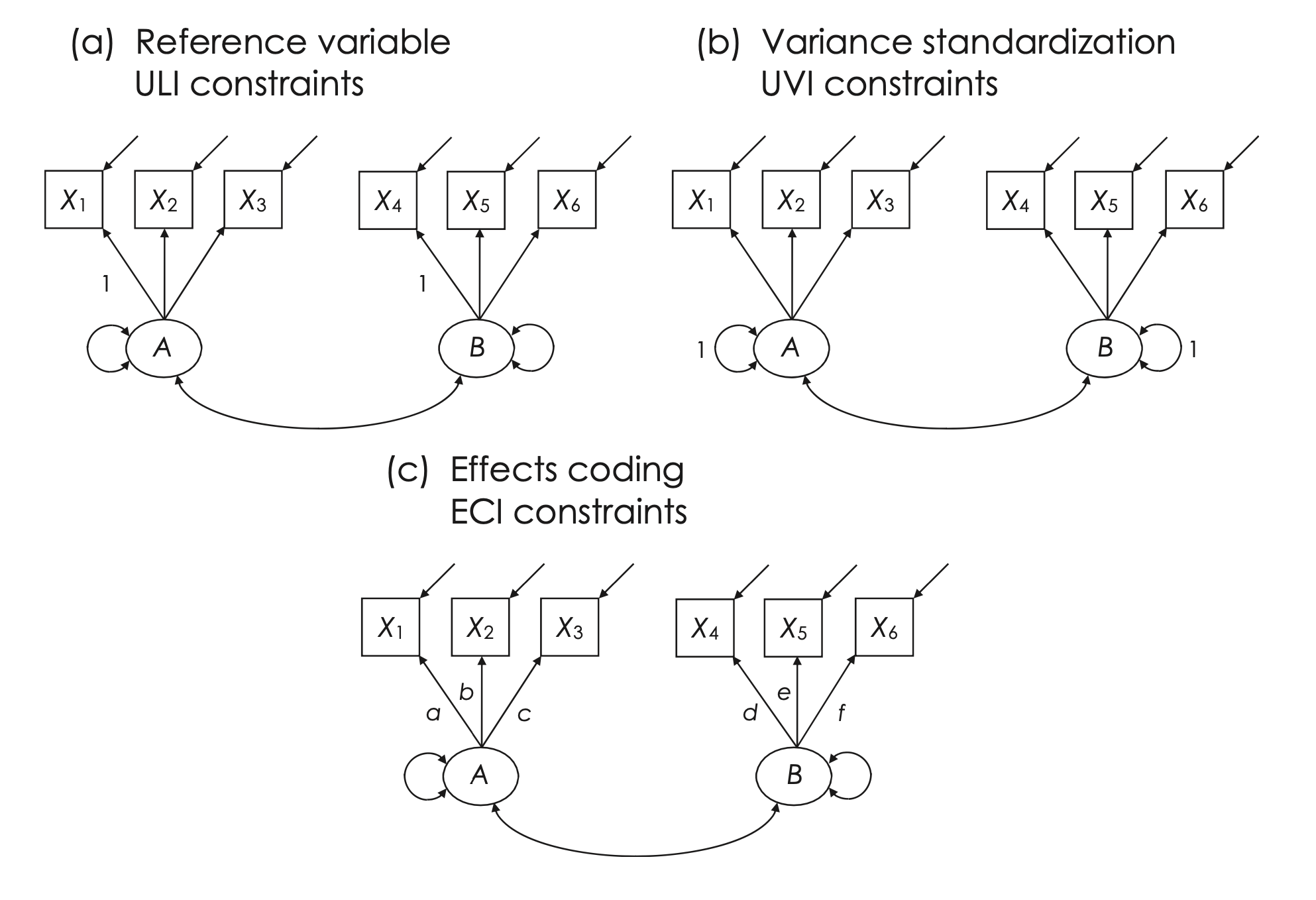 Quando più indicatori per lo stesso fattore presentano precisione equivalente e nessuno di essi è considerato particolarmente rappresentativo del concetto sottostante, la scelta dell’indicatore come variabile di riferimento diventa generalmente arbitraria. Questa selezione non influisce solitamente sull’adattamento globale del modello, sulla soluzione standardizzata, o sulle stime delle varianze di errore dell’indicatore nelle soluzioni non standardizzate. Le saturazioni fisse a 1.0 per le variabili di riferimento rimangono invariate nelle soluzioni non standardizzate e non sono soggette a test di significatività, poiché sono considerate costanti.