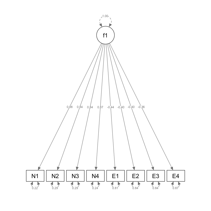 efa("efa")*f1 =~ N1 + N2 + N3 + N4 + E1 + E2 + E3 + E4