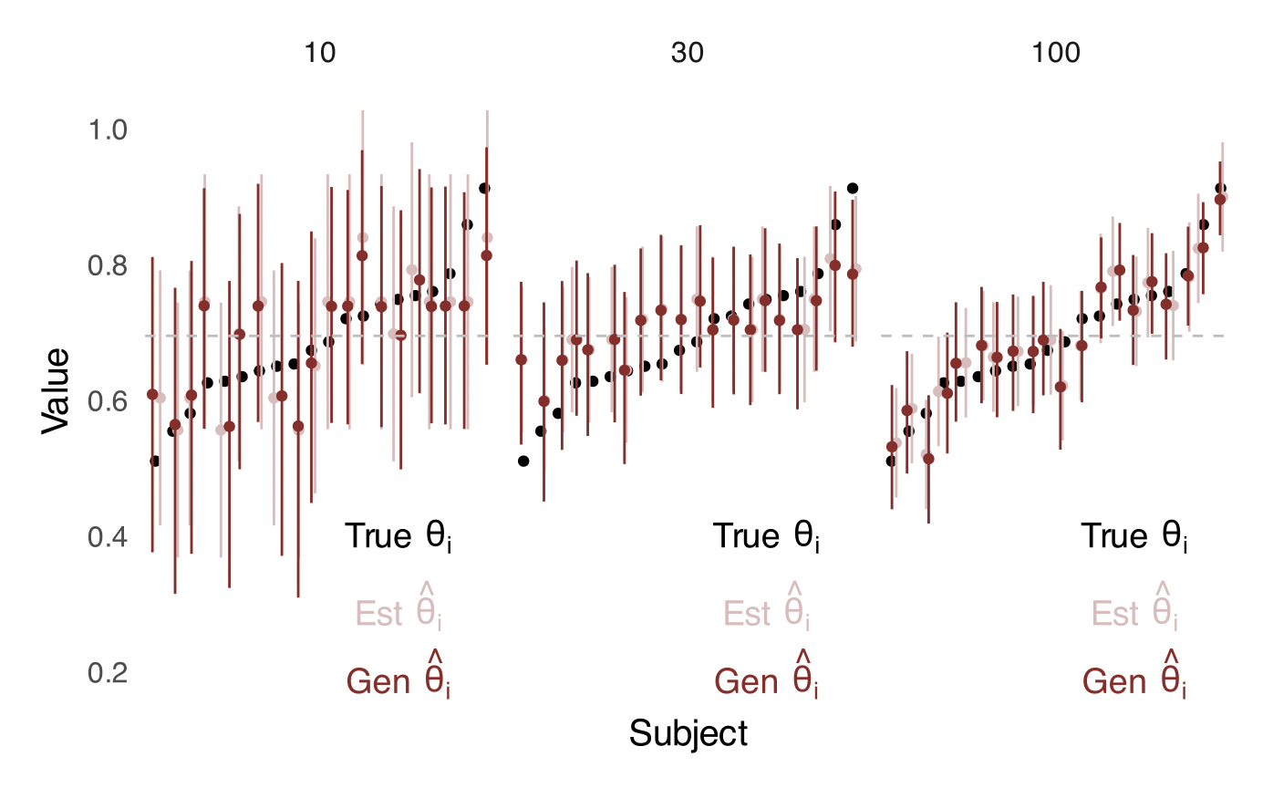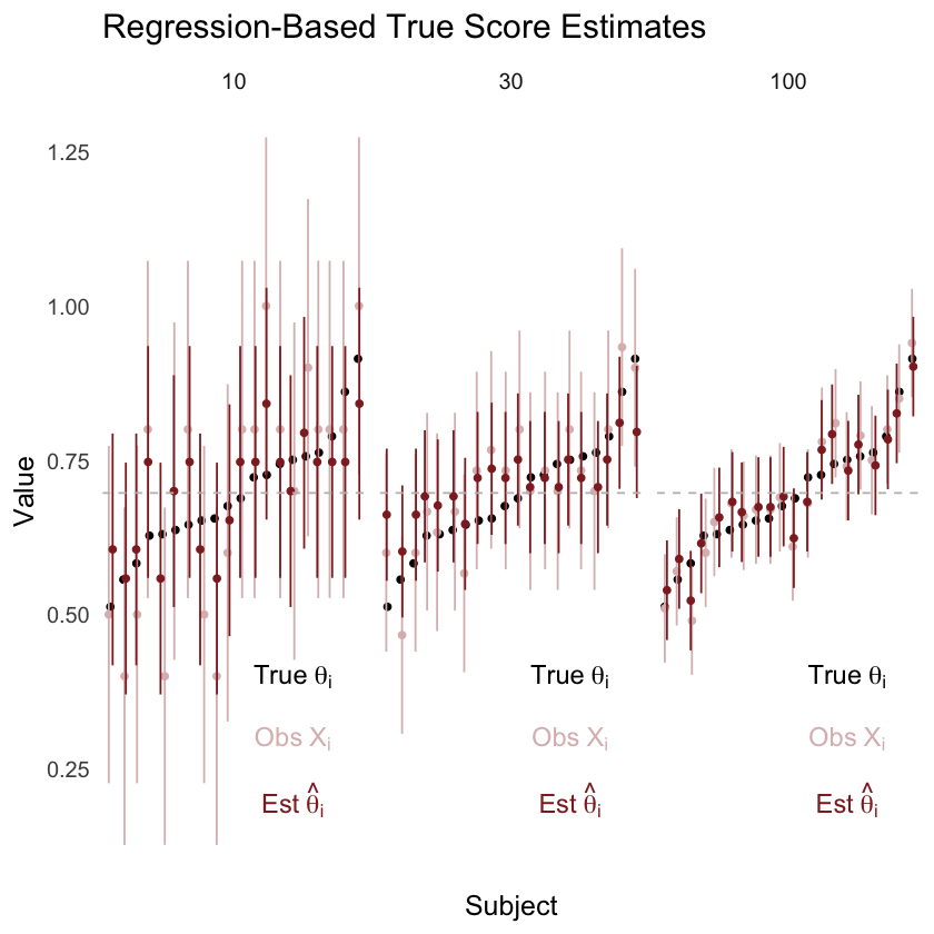 Per illustrare in modo pratico come avviene la stima dei punteggi veri, ossia il processo di pooling, eseguiremo una simulazione basata sul codice R di Nathaniel Haines. Questa simulazione genera dati seguendo una distribuzione binomiale per 20 soggetti, con una probabilità media di successo di 0.7. La simulazione considera tre diversi set di item: 10, 30 e 100, al fine di esaminare come le variazioni nel numero di item influenzino l’affidabilità ottenuta e, di conseguenza, gli effetti del pooling.