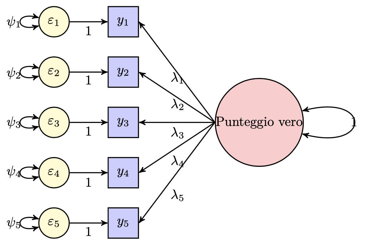 dove \(\mathbb{V}(\xi) = 1\) per ipotesi. La varianza di \(Y\) si decompone in due parti principali: la prima parte, \((\sum_i \lambda_i)^2\), rappresenta la varianza attribuibile al fattore comune, riflettendo la variazione legata all’attributo misurato dagli item; la seconda parte, \(\sum_i \psi_{ii}\), corrisponde alla somma delle varianze degli errori specifici di ciascun item, rappresentando la variazione dovuta agli errori di misurazione.