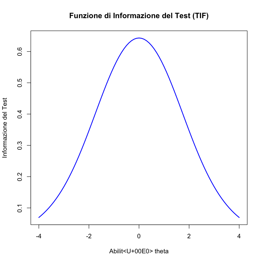 L’analisi dell’informazione fornita da un test nella Teoria delle Risposte agli Item (IRT) si amplia ulteriormente considerando la Funzione di Informazione del Test (TIF). Questa funzione è essenziale per comprendere quanto efficacemente un test nel suo insieme stima l’abilità degli esaminandi a vari livelli.