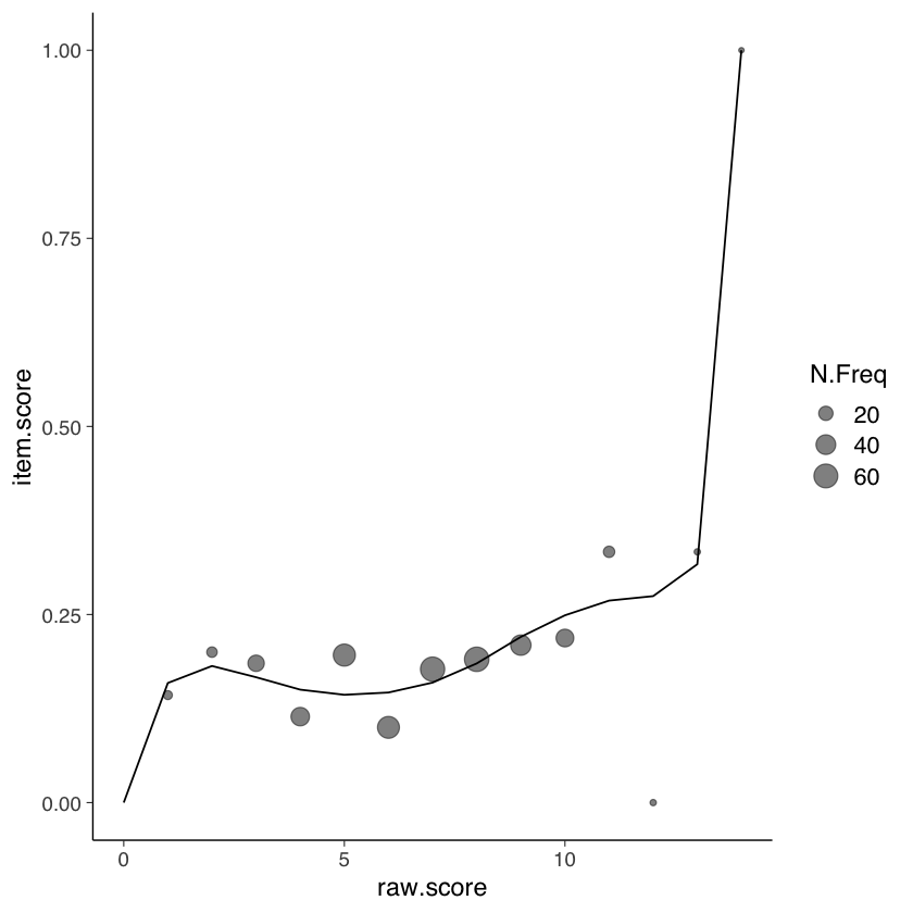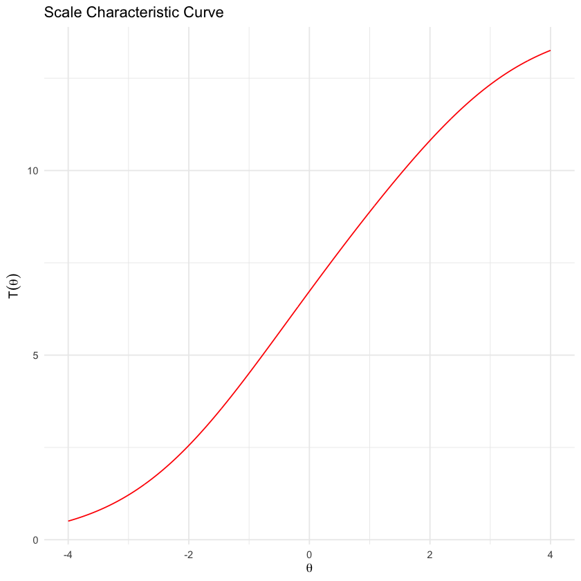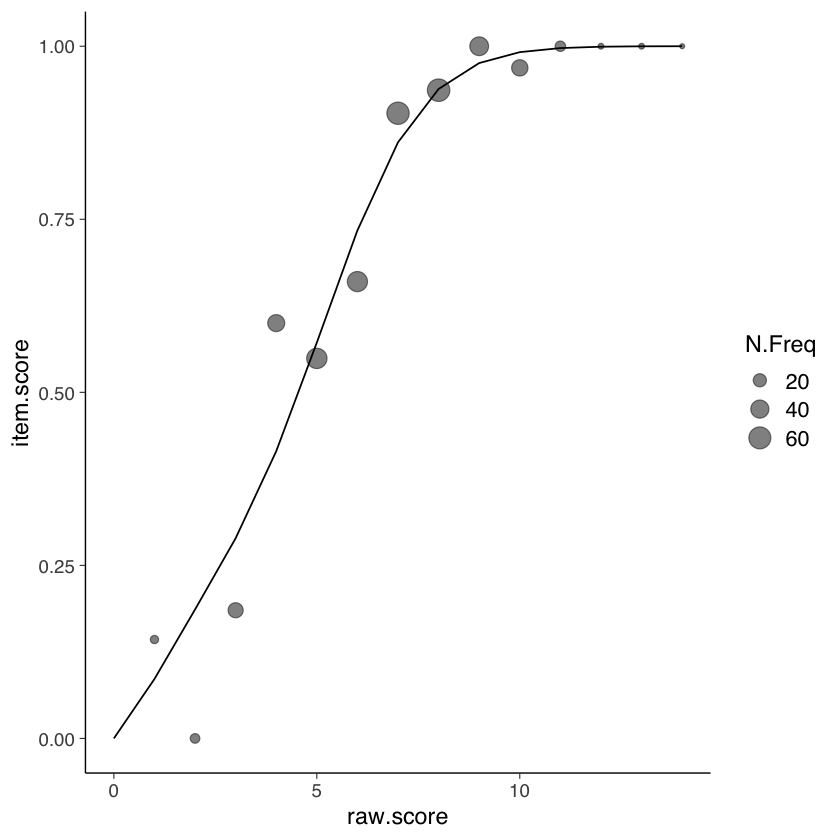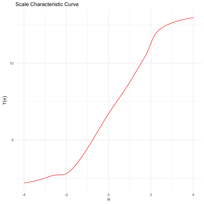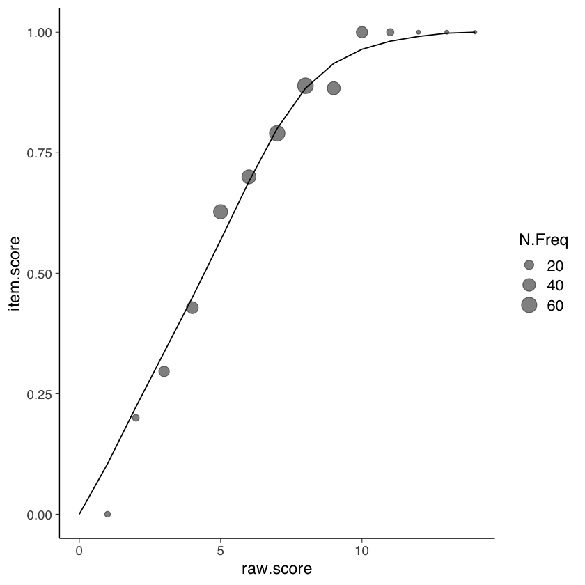 In conclusione, le curve caratteristiche del test forniscono un’efficace rappresentazione visiva di come il punteggio totale di risposte corrette possa riflettere l’abilità latente misurata dal test, offrendo un’utile prospettiva per valutare l’idoneità del punteggio totale come indicatore del tratto latente.