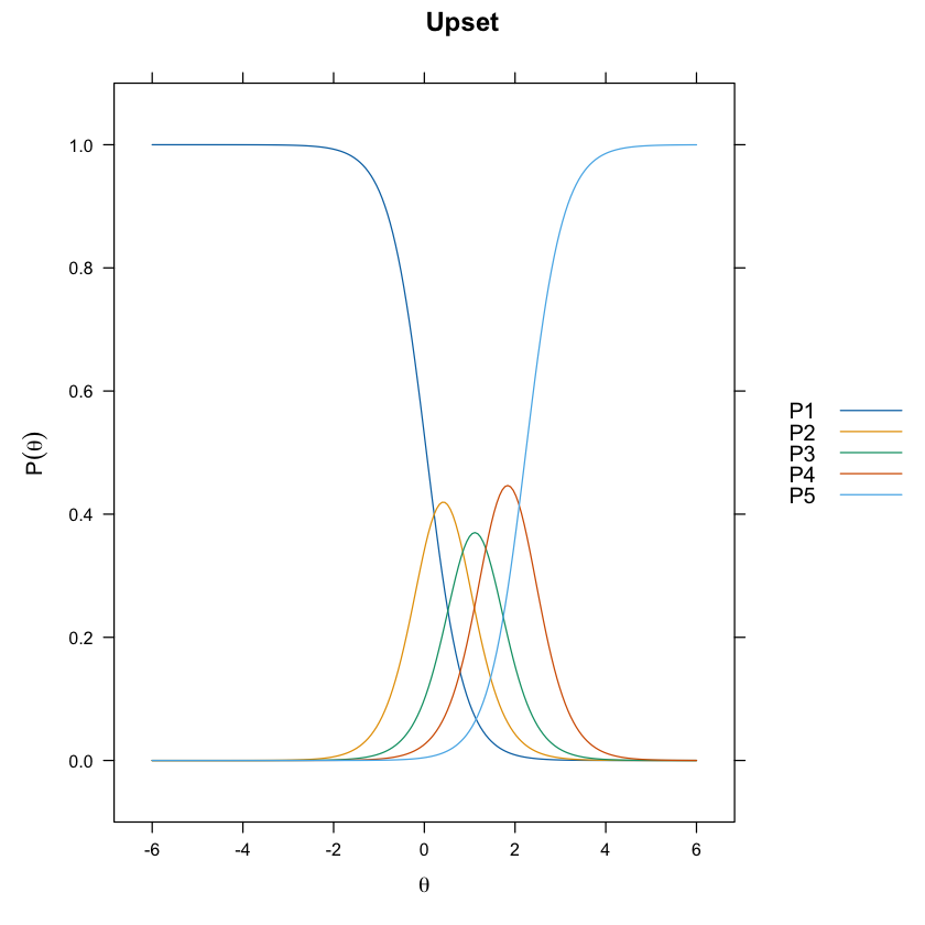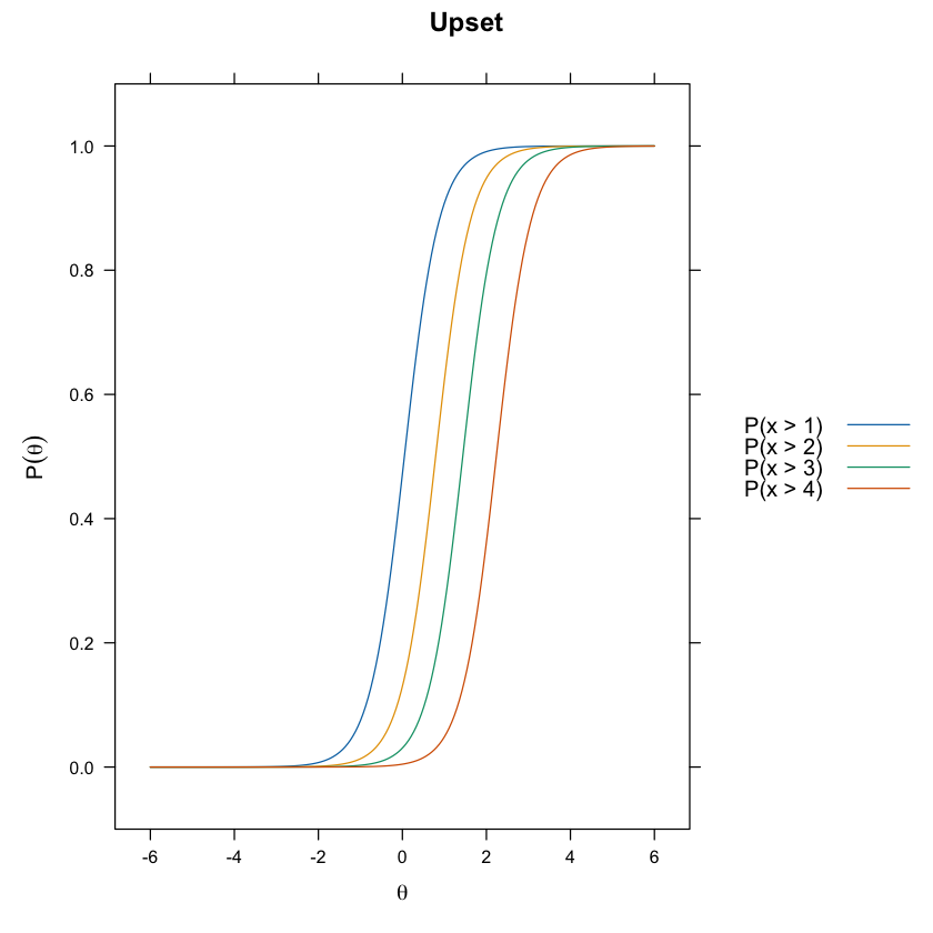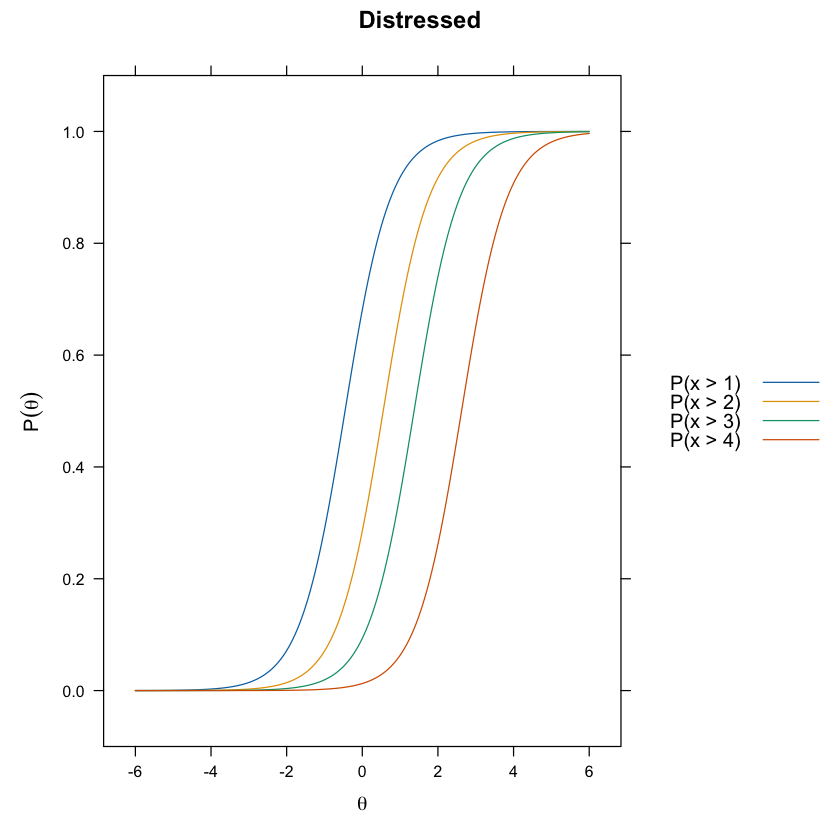 Le curve logistiche derivanti tracciano graficamente come la probabilità di rispondere in una determinata categoria cresce all’aumentare di \( \theta \), fornendo una visione dettagliata del processo decisionale del rispondente.