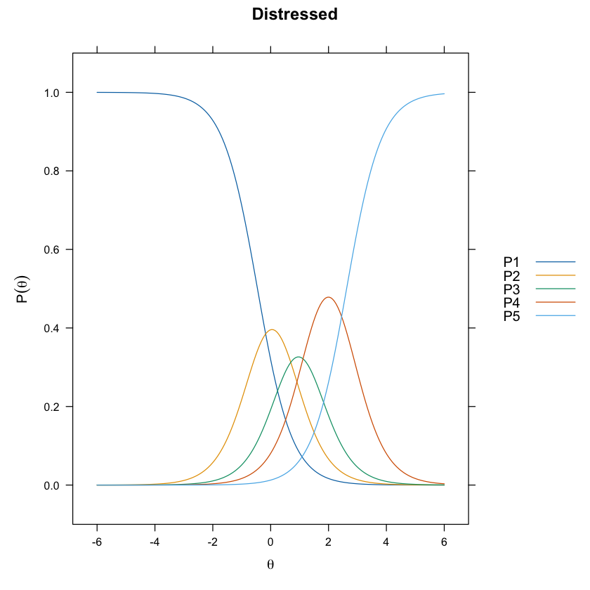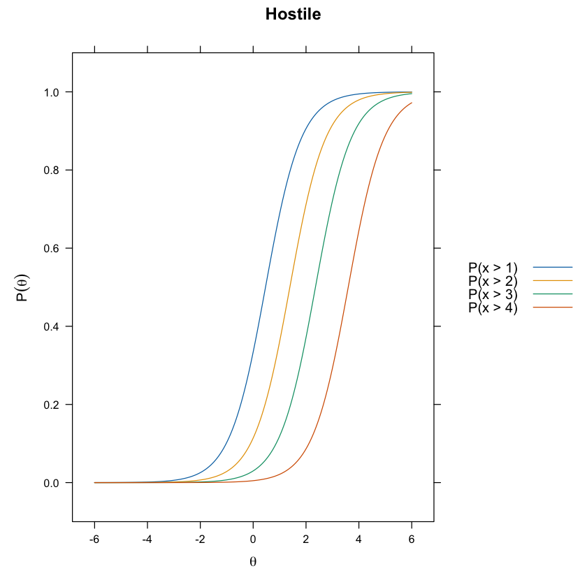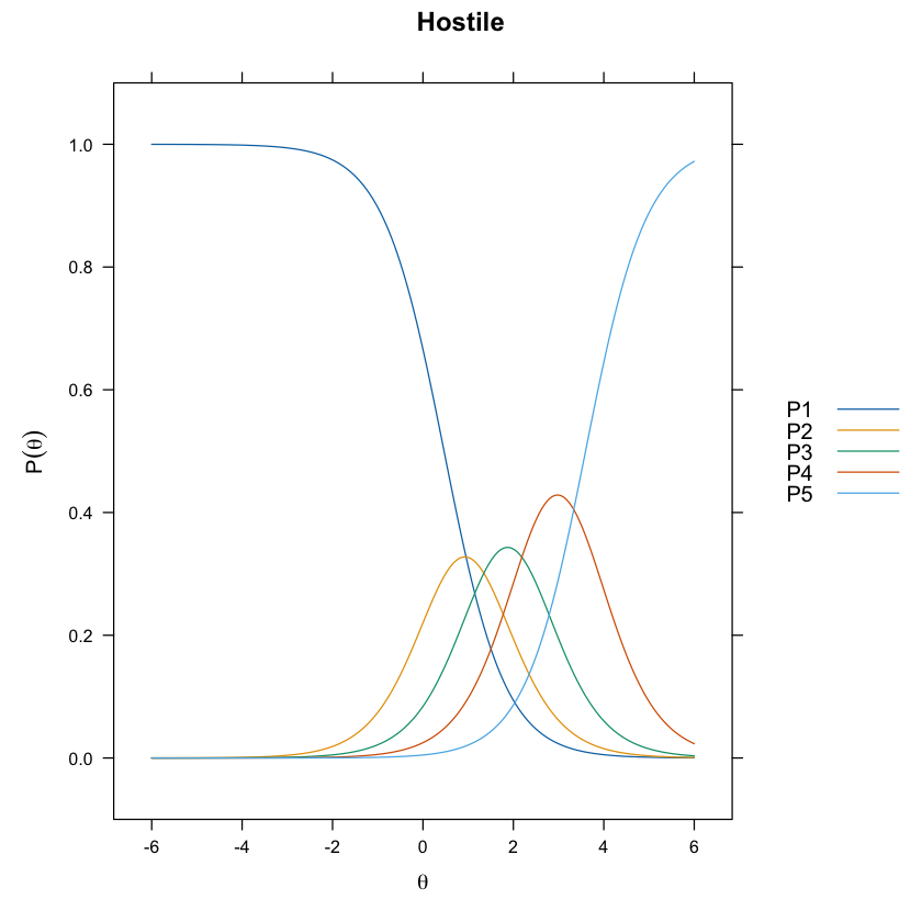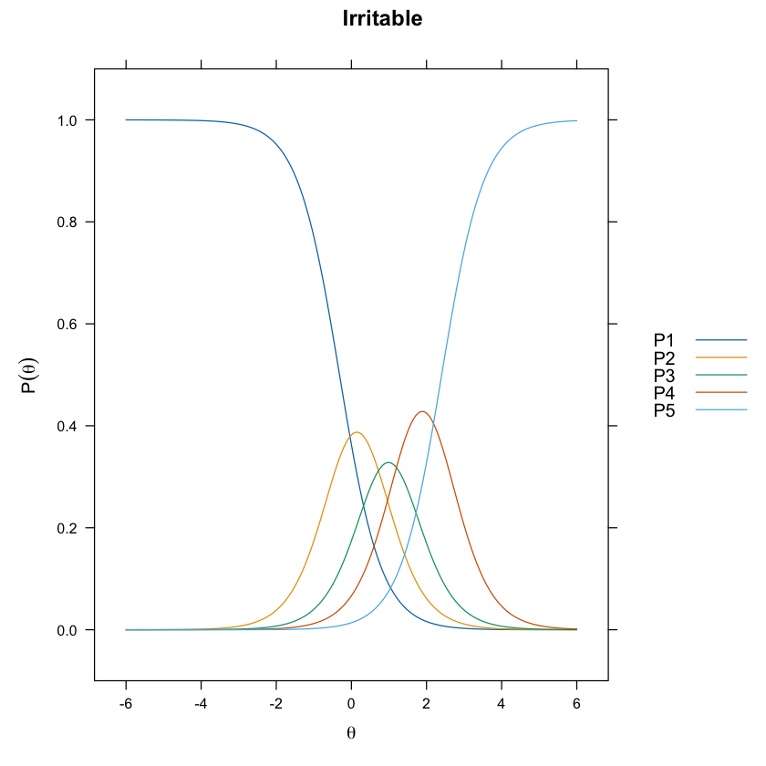 Immaginiamo di avere un item che misura l’opinione su una politica ambientale su una scala da 1 a 4. Un individuo con un basso valore di \(\theta\) potrebbe avere una probabilità molto alta di scegliere “1 - completamente in disaccordo”. Man mano che il valore di \(\theta\) aumenta, la probabilità di scegliere categorie superiori (2, 3, 4) aumenta in accordo con i parametri di difficoltà e discriminazione stimati dal modello.