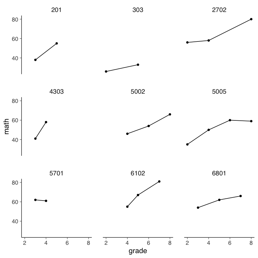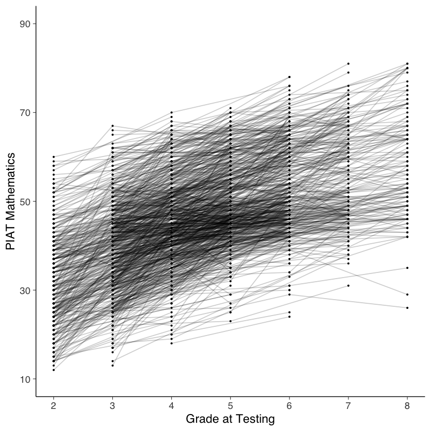 Come in qualsiasi analisi statistica, è importante esaminare attentamente i dati. Ciò include la produzione di sia riepiloghi quantitativi che visualizzazioni. Per fare un esempio di visualizzazione di dati longitudinali, esaminiamo il cambiamento nel rendimento in matematica dei bambini durante la scuola elementare e media utilizzando il set di dati NLSY-CYA [si veda Grimm et al. [GRE16]]. Da questi dati, selezioniamo solo il grado scolastico, il codice identificativo e il punteggio di matematica.
