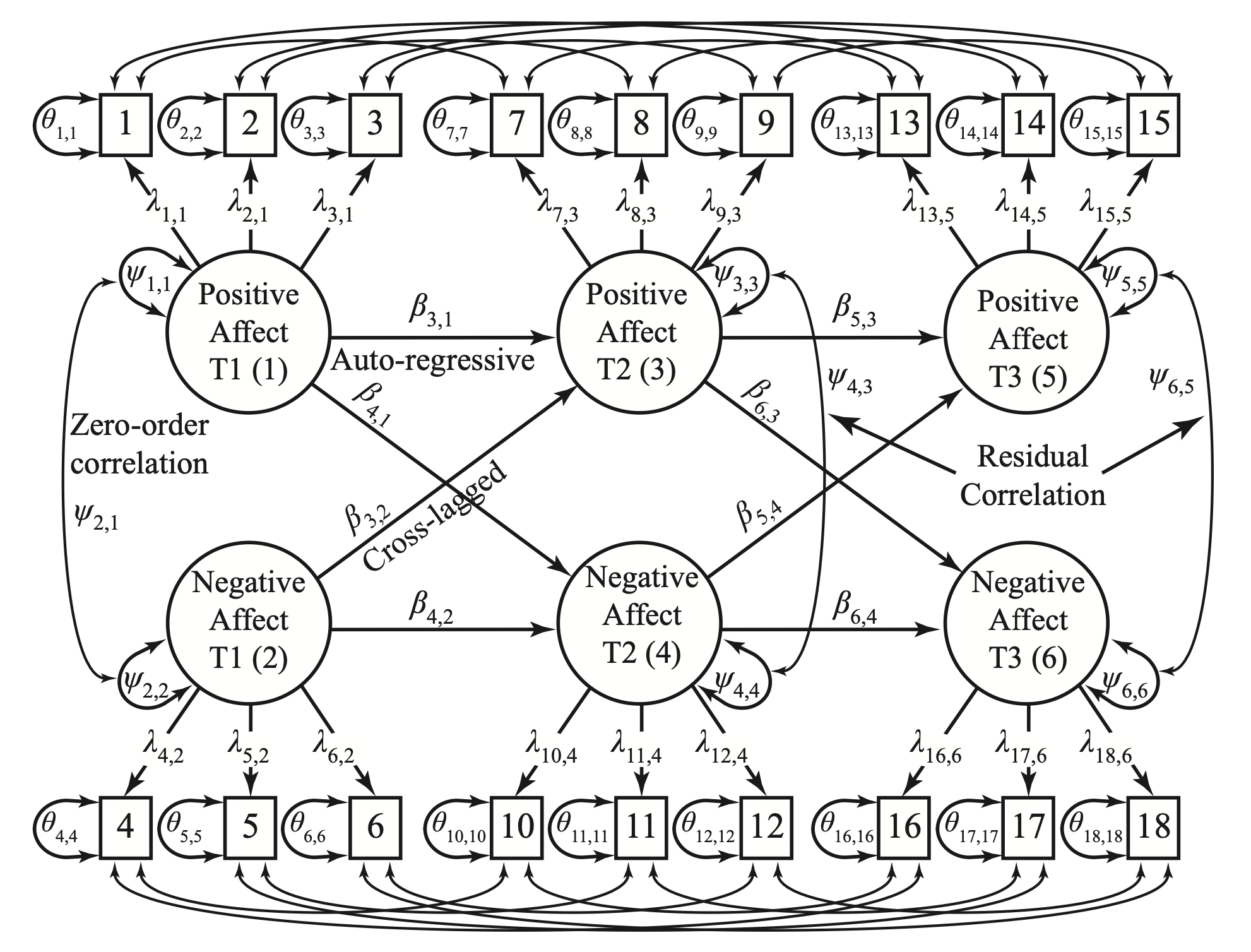 Fig. 75.1 Etichette dei parametri per tre punti temporali con affetto positivo e affetto negativo: Un’analisi di base del modello panel direzionale. Nota. Si consente l’associazione delle varianze residue tra gli indicatori corrispondenti nel tempo. (Figura adattata da Little [Lit23]).#